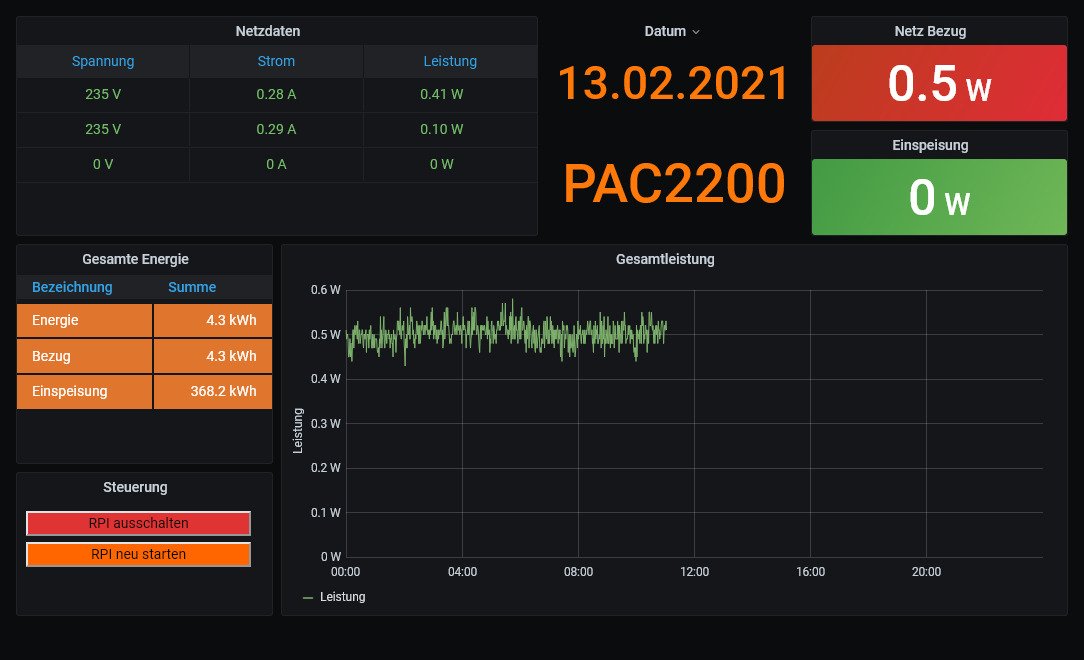 Der 3 Phasen Zähler Solarlog Pro -Mod wird über ein RS485 zu USB Adapter mit FTDI Chipsatz ausgelesen. Der Adapter muss auf die serielle Geschwindigkeit von 9600 Baud 8N1 eingestellt werden! Das Standard Dashboards dafür heißt "SmartMeter" im Folder "Sonstige". Die Daten können aber auch selber in dem jeweiligen Wechselrichter Dashboard eingebaut werden. Zusätzlich können die Daten auch per MQTT übertragen werden. Die Anbindung an eine HomeMatic ist noch nicht vorhanden.