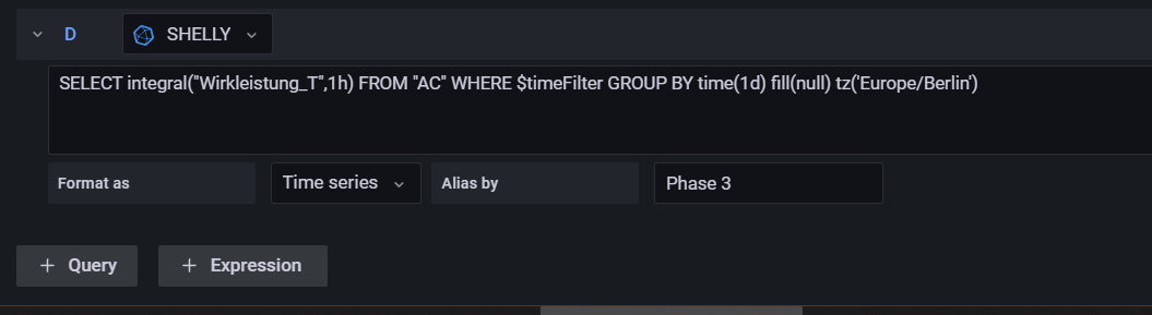 Ich greife das alte Thema mal auf. Anscheinend haben sich aber laut Deinem Dashboard die Abfragen geändert, so dass ich ein wenig ins Blaue beschreiben muss (jetzt wohl "SELECT non_negative_difference(last("Import active energy")) * 0.27 FROM "energy" WHERE $timeFilter GROUP BY time(24h) fill(0)").