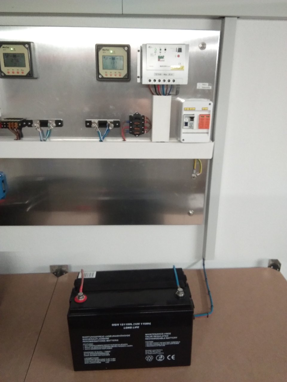 Mit der Anlage läuft der 65 Zoll Fernseher. Die Akkus sind in 24 Volt geschalten und liefern Strom für einen normalen Wechselrichter mit max. 300 Watt Leistung.