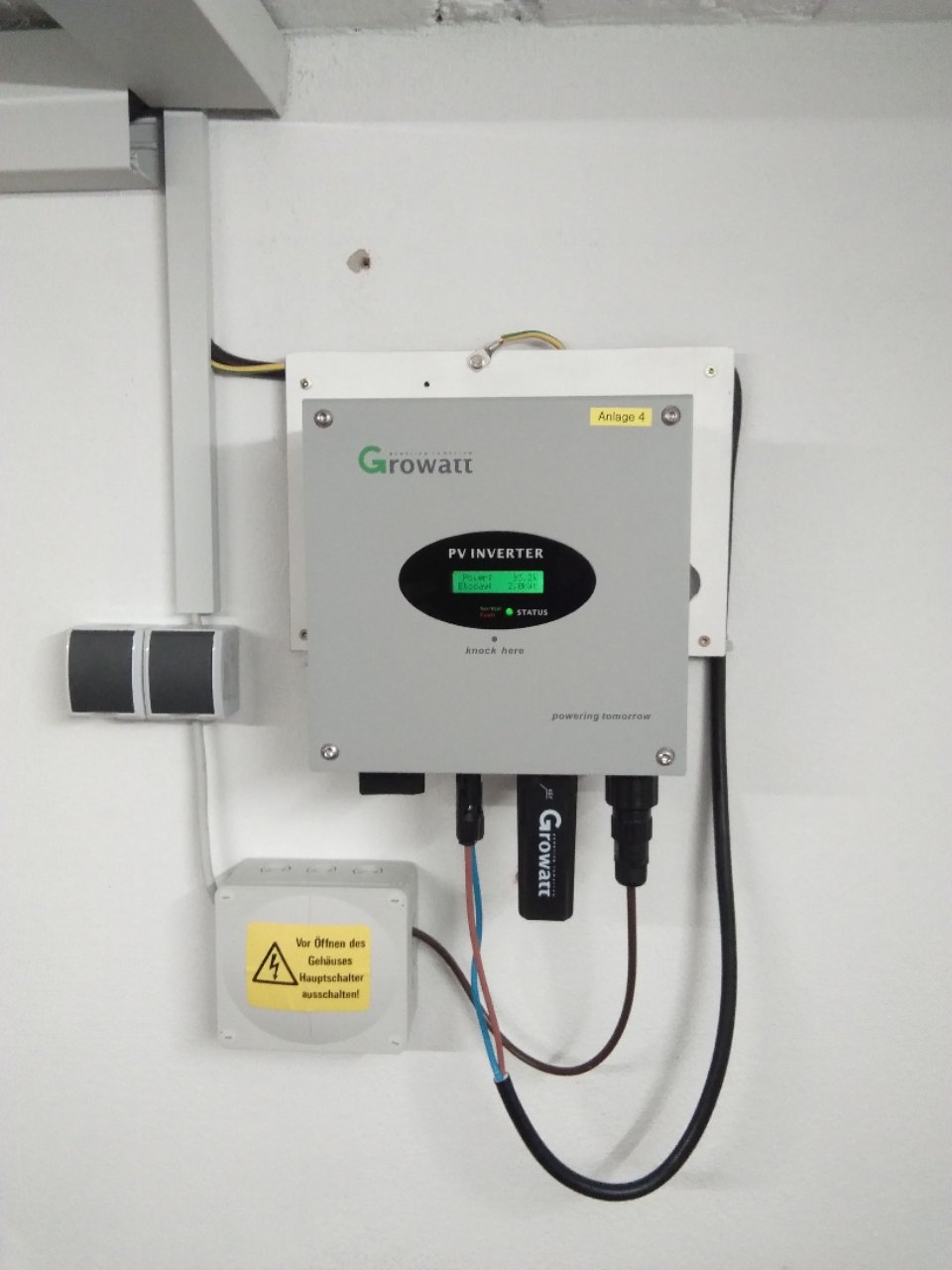 Ist ein Growatt Wechselrichter zum Einspeisen ins Netz. Mit max. 1000 Watt Leistung. Wenn die Sonne scheint dann steht der Stromzähler auf der Stelle. Egal ob Verbraucher an sind oder nicht. Ausser beim Herd