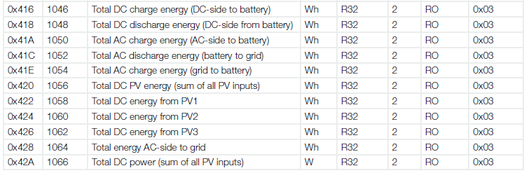 So sind u.a die Batterieströme für das Laden und Entladen nicht wirklich abrufbar. Die Gesamtleistung des WR wird bei Batteriebezug falsch dargestellt.