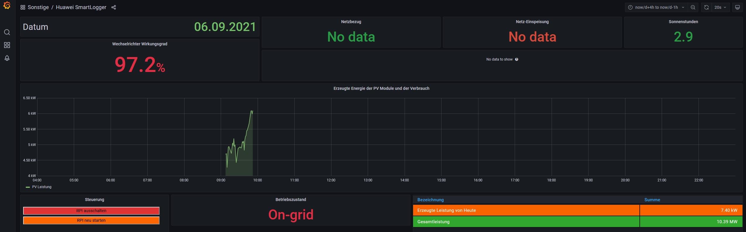 In Grafana zeigt es mir noch keine Daten vom Smartlogger an (Wetter und Solarprognose läuft bereits), vermutlich weil die Wechselrichter noch nicht laufen - die Konfig. in der Solaranzeige ist aber soweit schon fertig.
