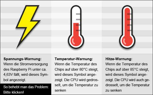 Diese Warnsymbole zeigt der Raspberry Pi: