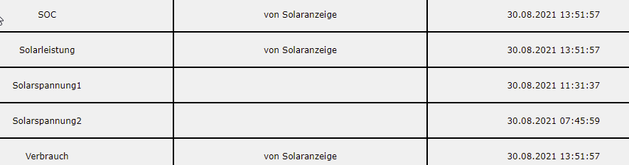 In der Homematic sind die Variablen korrekt definiert: Alle anderen Variablen werden auch befüllt, nur eben nicht die Solarspannung1 und 2 (3 wird nicht gebraucht, da kommt die Batterie dran).