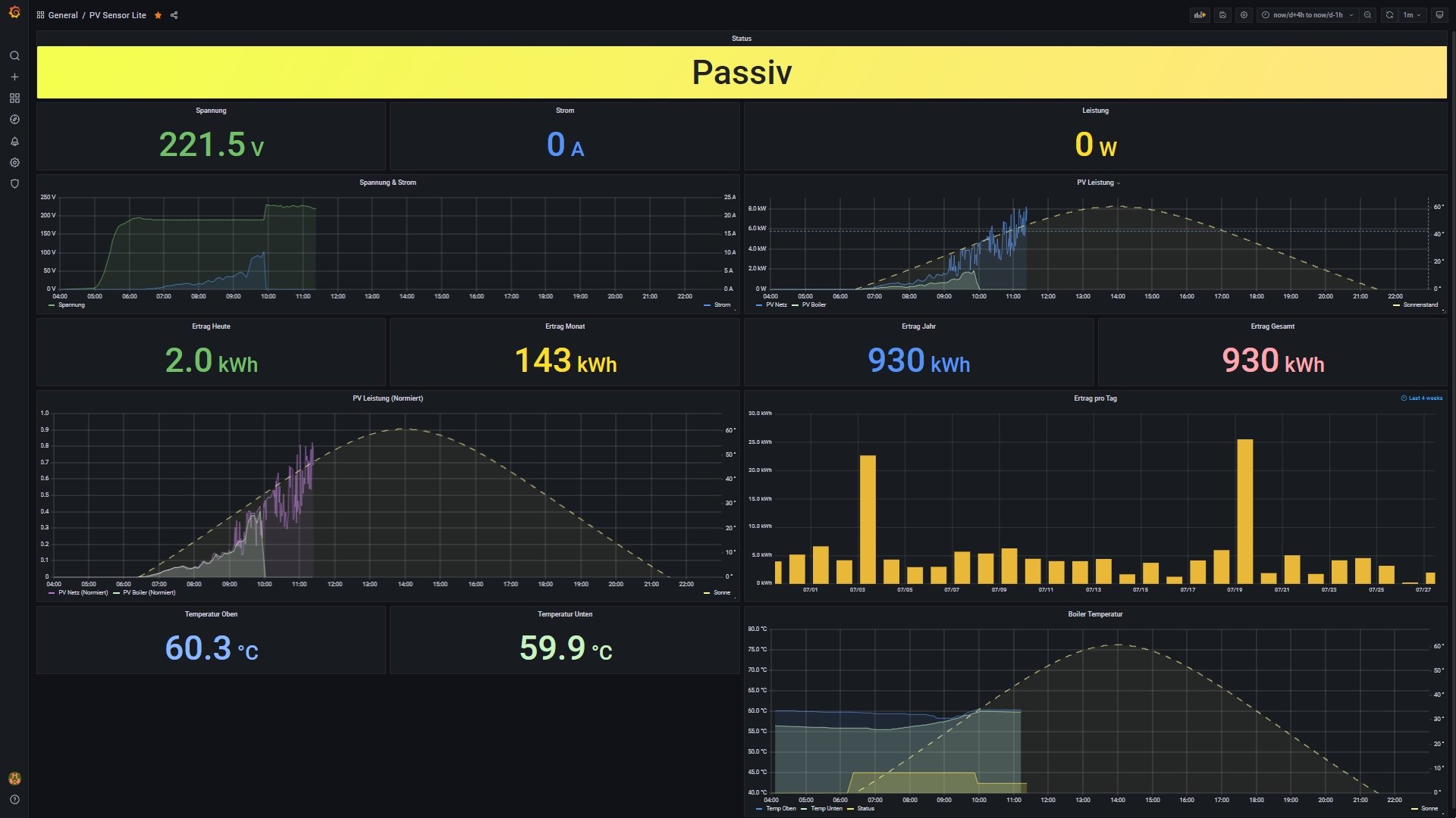 Ab ca. 18:30 war der Boiler geladen. Man sieht jetzt die Leerlaufspannung der Module.