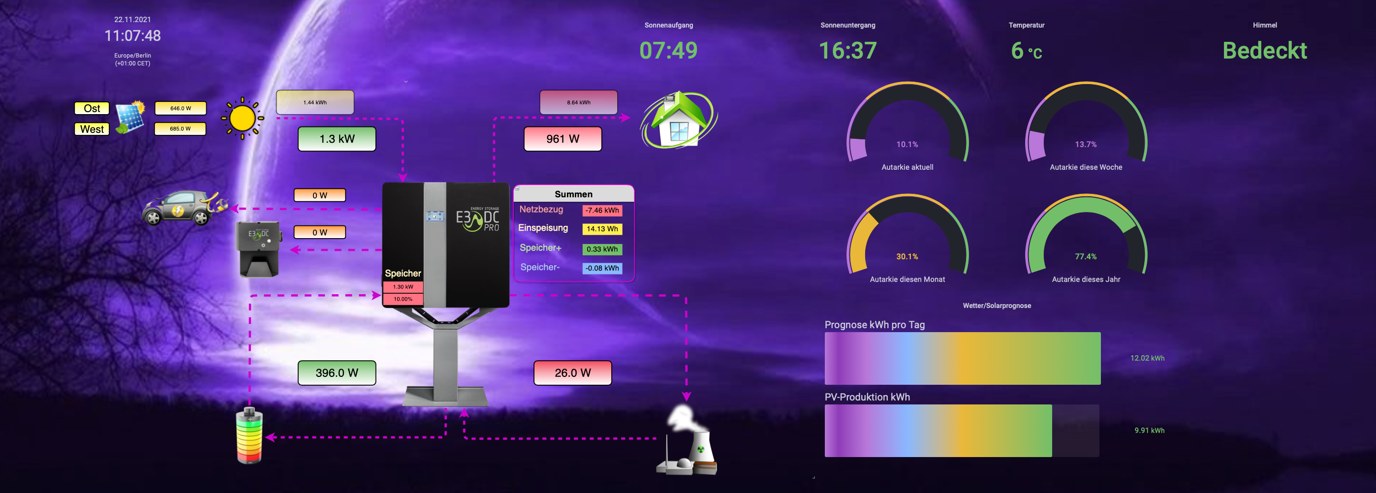 Das mittlere Dashboard ist mit Animation der Energieflüsse