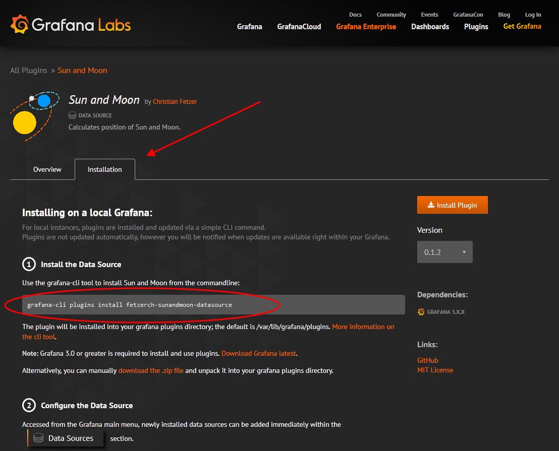- Die oben eingekreiste Zeile mit dem Wort sudo + Leestelle davor eingeben. In diesem Fall also "sudo grafana-cli plugins install fetzerch-sunandmoon-datasource" + ENTER. Die Zeile ist bei jedem Plugin anders!