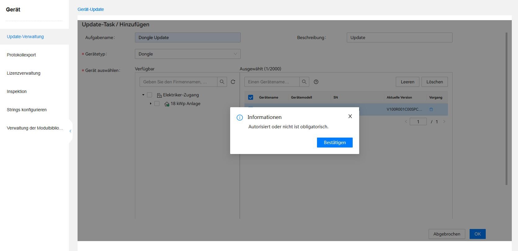 Das Update kannst du auch in FusionSolarWeb anstoßen! Einfach bei Huawei einloggen und unter Gerätemanagement das Update einstellen.