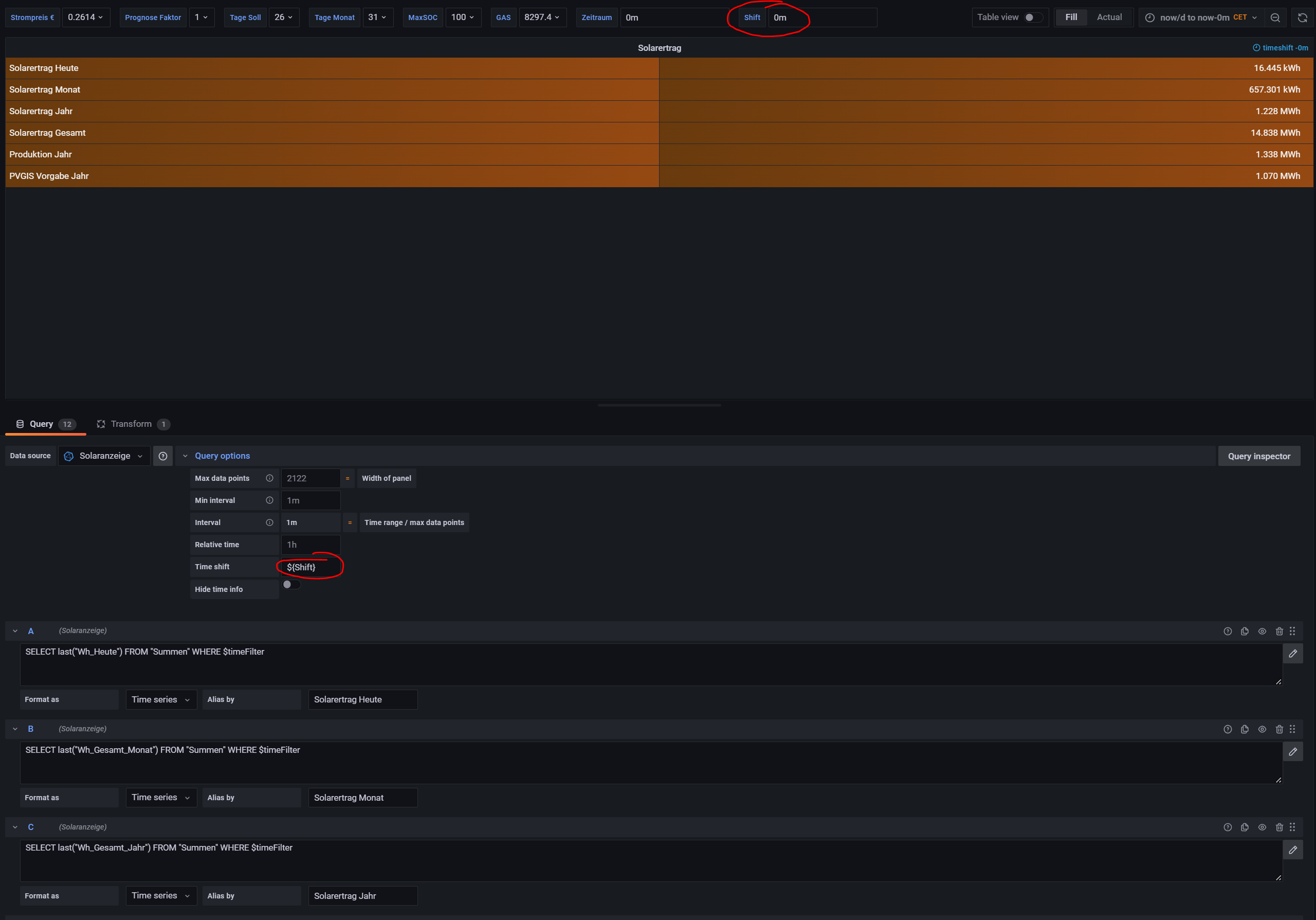Ich habe mehrere solche Panels mit verschiedenen Werten (Erzeugung / Produktion / Kosten und Ertrag / Eigenverbrauch und Autarkie usw.), mit dieser einen Eingabe oben im Dashboard ändern sich sofort alle diese Auswertungen auf den gewünschten Vergleichszeitraum (natürlich ist in allen Panels dazu die Query option angepasst).