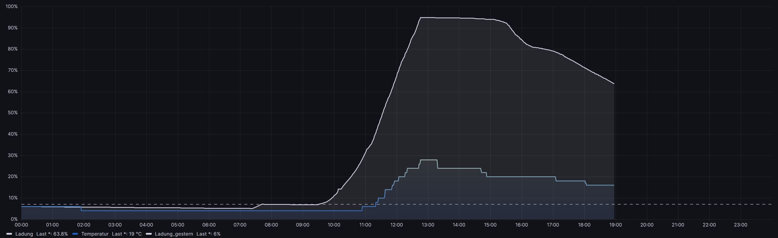 SELECT mean("Status") AS "Ladung" FROM "Batterie" WHERE time >= (${__from:date:seconds}000000000 - 86400000000000) and time < ${__from:date:seconds}000000000 tz('Europe/Berlin')Wird in der Auswahl oben rechts z.B. Yesterday ausgewählt, dann ist der Wert von Vorgestern im Select inbegriffen.
