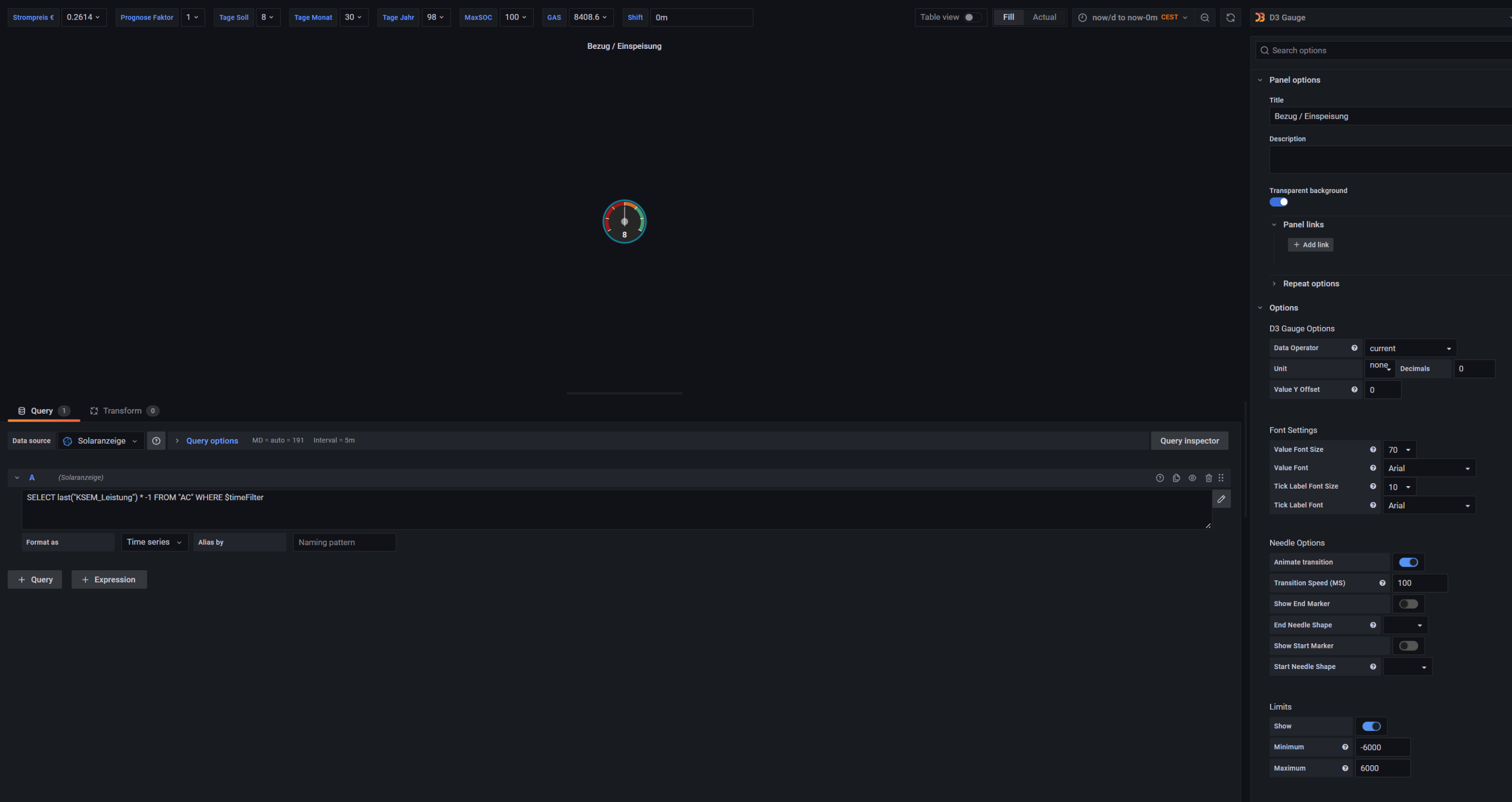 Das geht, es gibt ein Plugin D3 Gauge. Hier nur den Bereich z.B. mit -6000 bis 6000 angeben und schon steht der Zeiger bei 0 oben. Ich benutze das z.B. für Einspeisung und Bezug: