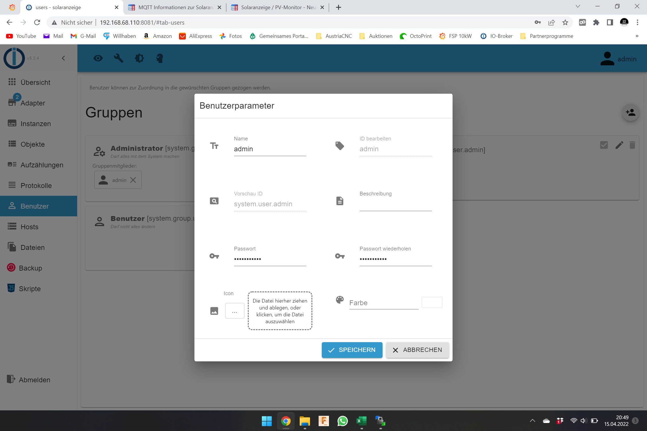Das selbe Passwort und den selben Benutzernamen hab ich im ioBroker eingestellt: