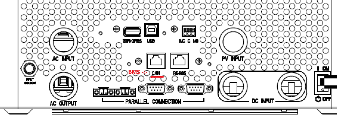 Zusätzlich gibt es noch eine dedizierte RS485 Schnittstelle. Die RS485 ist nicht weiter im Handbuch beschrieben. Daher dachte ich die Buchse BMS=CAN und RS485=RS485.