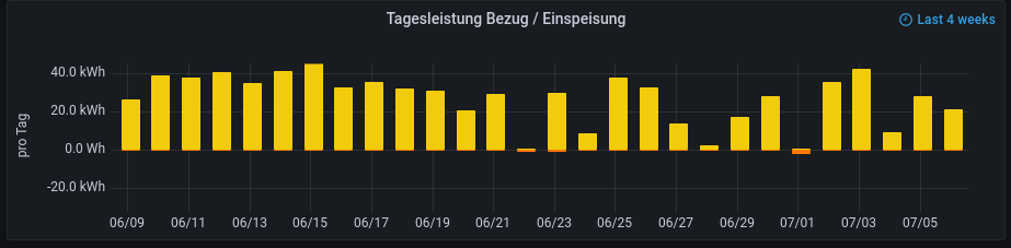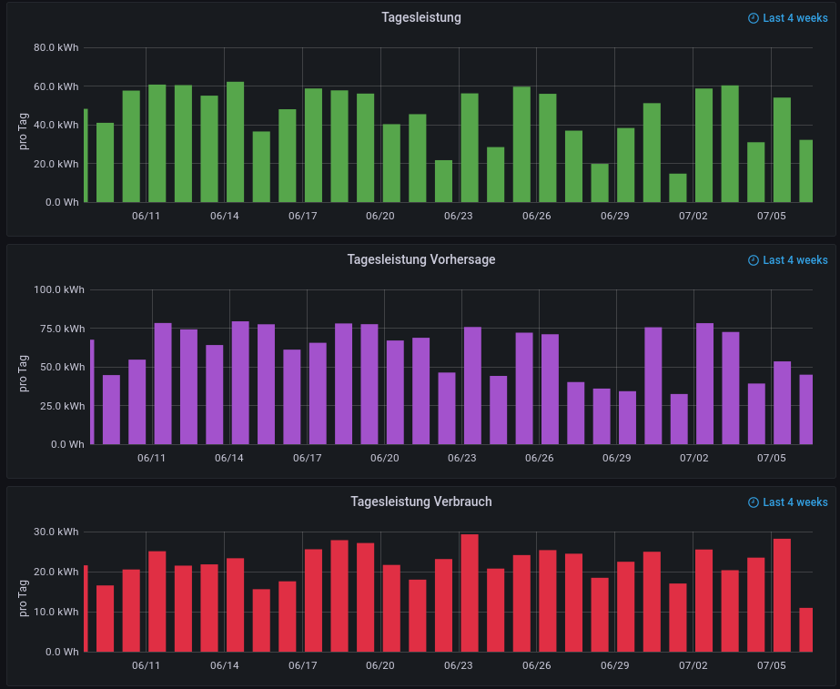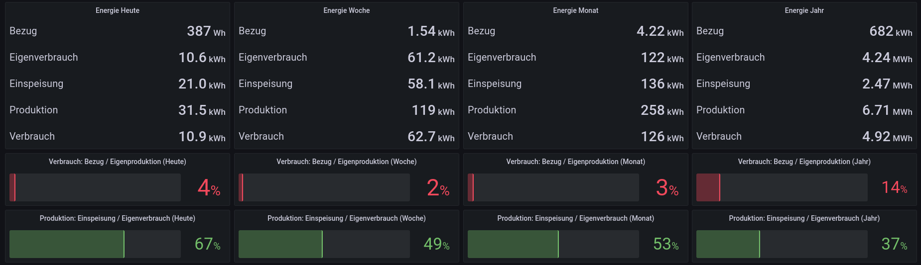 So sieht das ganze bei mir zum Schluss im Grafana-Dashboard aus: Um die Daten zu holen, verwende ich Python, da ich zu dem Zeitpunkt, als ich die Skripte geschrieben habe noch kein PHP konnte. Mit PHP ist das natürlich auch möglich.