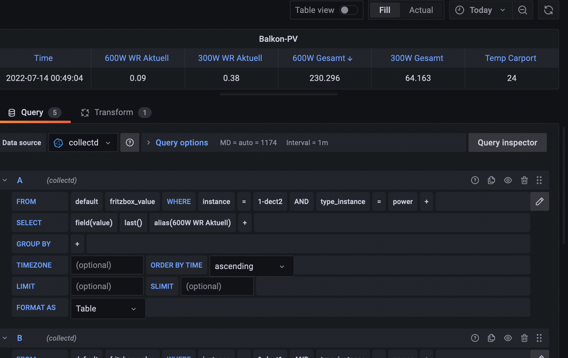 14. Anschließend könnt ihr ein Panel erzeugen und die Daten für aktuelle Leistung wie im Screenshot ersichtlich aus der DB ziehen. Gruß,