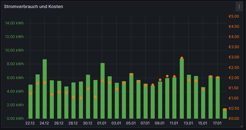 Auf diesem Bild sieht man den täglichen Stromverbrauch, sowie den täglichen Gesamtpreis des bezogenen Stromes. Beide Werte liefert die Tibber API. Ist der rote Punkt (täglicher Gesamtpreis) oberhalb des Balkens ist der Strom recht teuer an diesem Tag. Ist er innerhalb des Balkens ist der Börsenstrompreis peiswert gewesen.