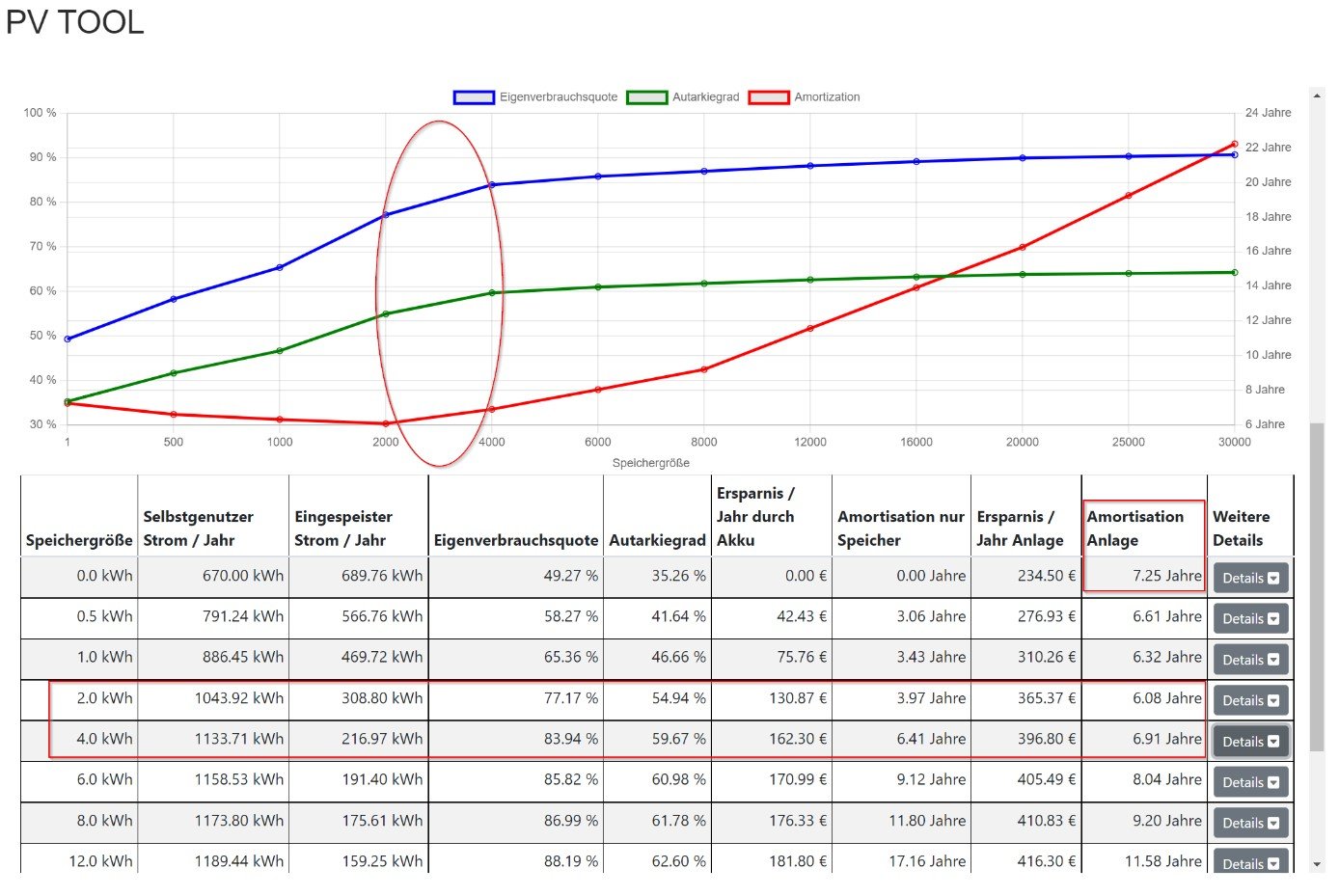 Zum 2 kWh Akku sei angemerkt, dass der Rechner leider keine variablen Speicherkosten zu lässt, hier muss man etwas mit den Werten etwas Spielen. Ein kleinerer Speicher hat in der Regel auch höhere Kosten pro kWh und bei mir war es in der Beschaffung so, dass die LiFePo4 Zellen für einen 3.5 kWh Speicher marginal höher waren, als die besorgten für den 4.3kWh (Brutto Kapazität, davon sind bei LiFePo4 Zellen knapp 4kWh nutzbare Kapazität möglich).
