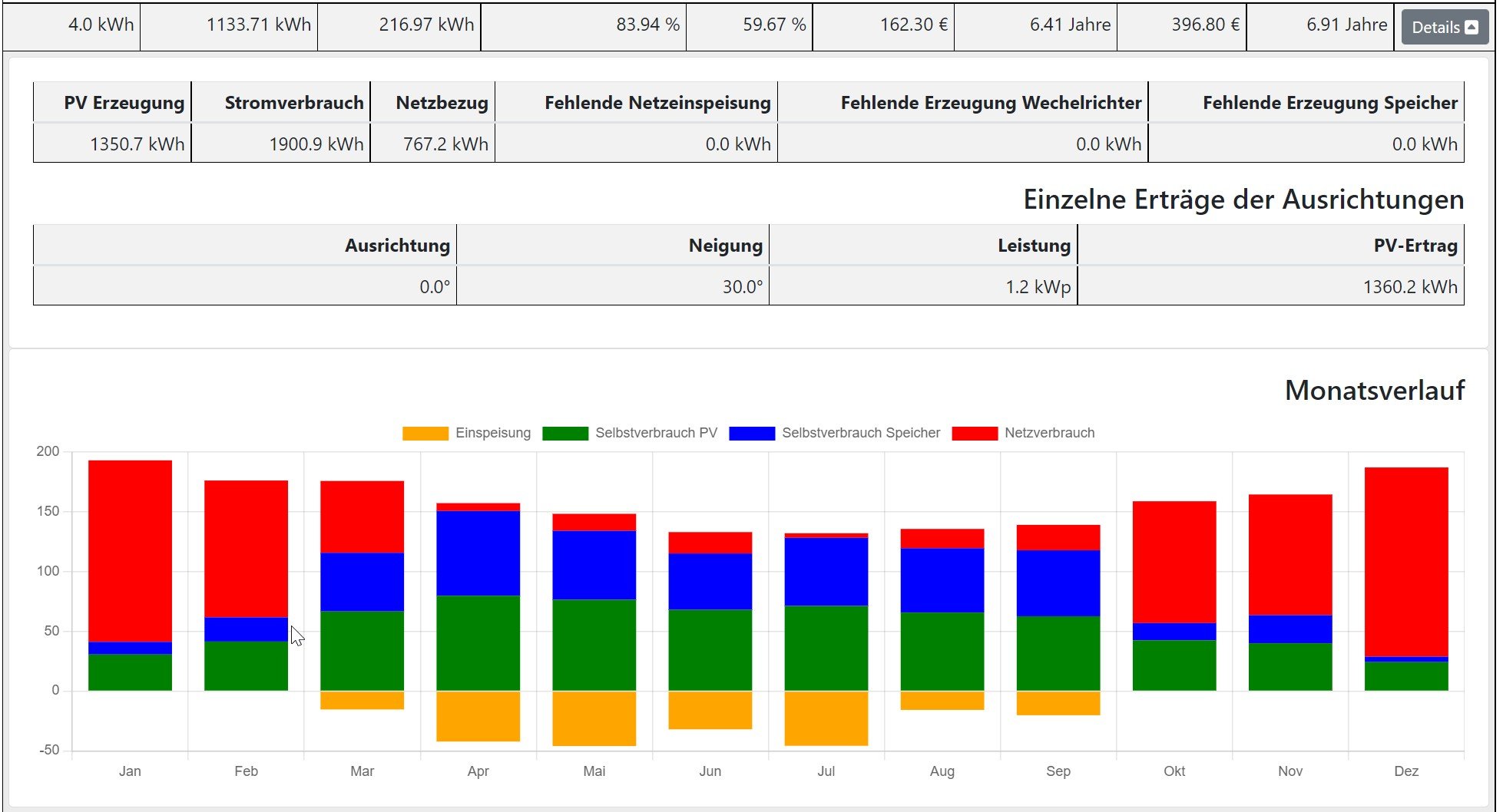 Der Wechselrichter ist jedoch nur mit 600W einspeisefähig und nicht wie vom Tool angenommen mit 1200W, was den Netzbezug durch weniger Peak Abdeckung von „Großverbrauchern“ leicht erhöhen dürfte.