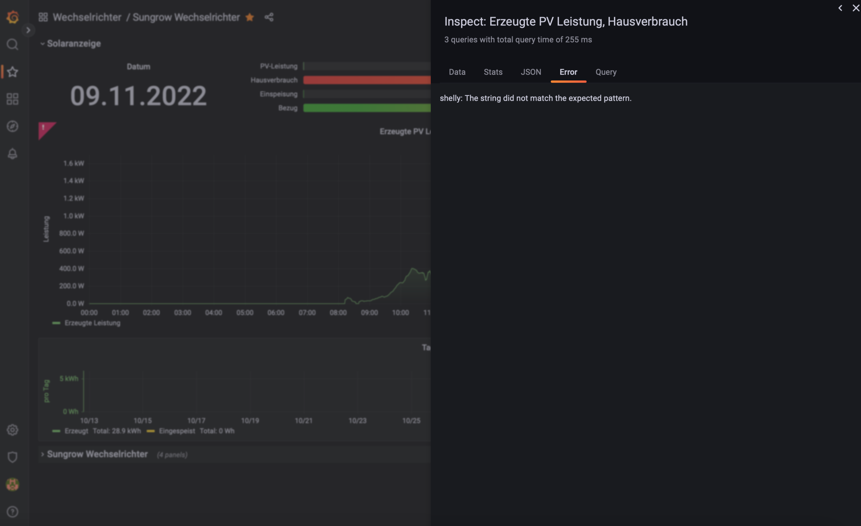 Jetzt meine Frage. In dem einen Moment sieht alles schön aus (siehe Anhang) und im nächsten Moment erhalte ich einen Error in der Grafana Oberfläche (siehe Anhang) und es werden keine Werte dargestellt. Error: the string did not match the expected pattern