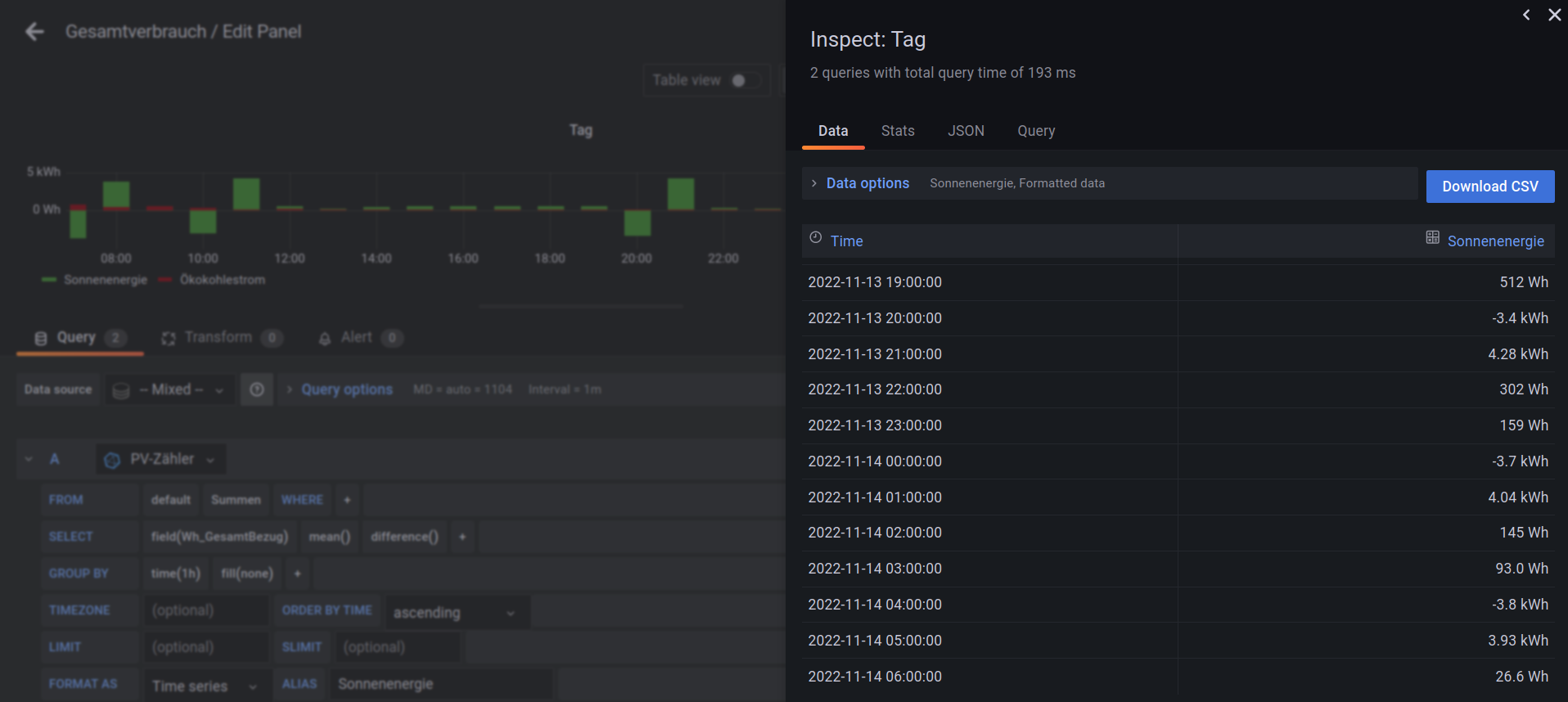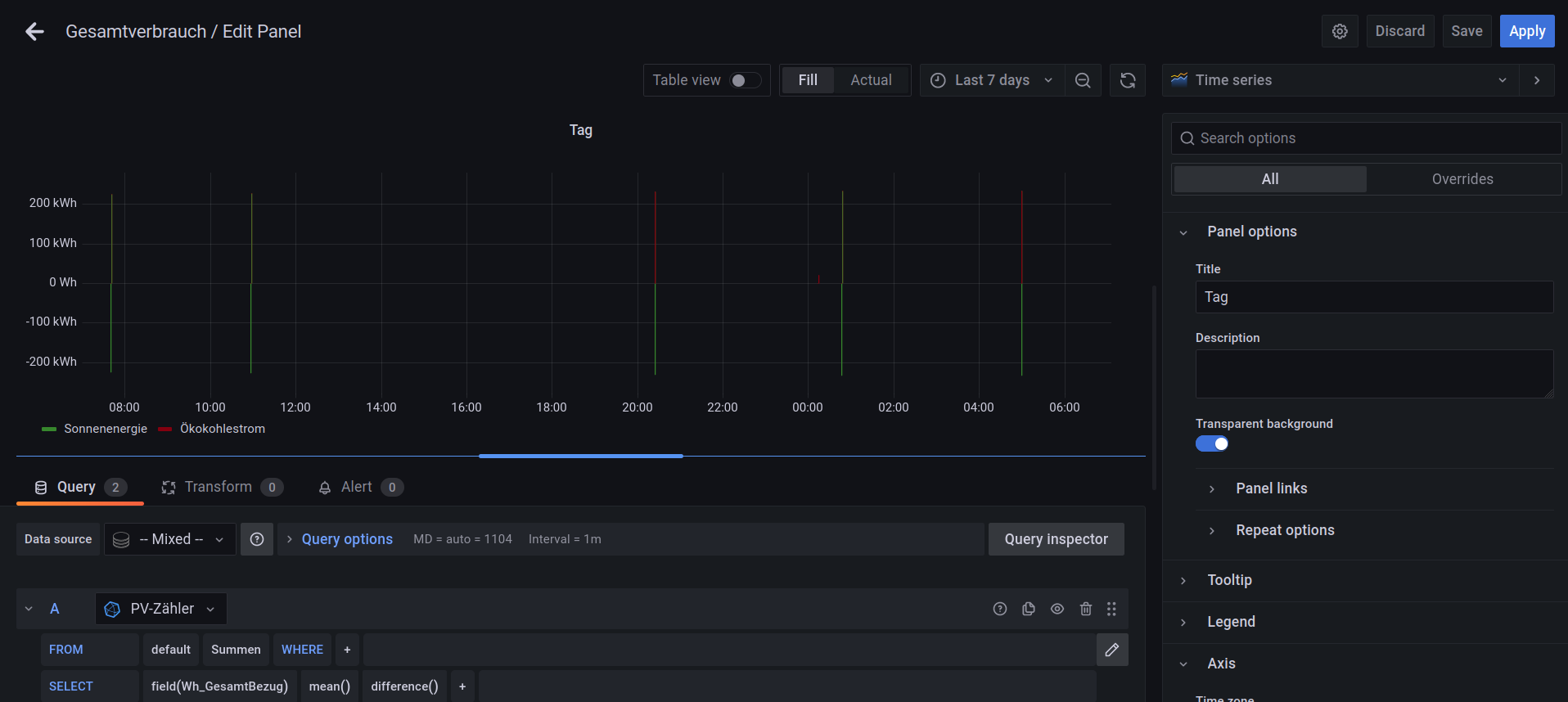 Meine beiden Smartmeter liefer kurzfristig falsche negative und positive Werte die sich gegenseitig wieder aufheben allerdings ergibt dieses eine sehr unschöne Visualisierung. Wenn ich die Werte Stündlich zusammenfasse und anzeigen lasse dann kann man mit der Anzeige arbeiten. Im Minutentakt kann man mit der Anzeige nichts mehr anfangen.