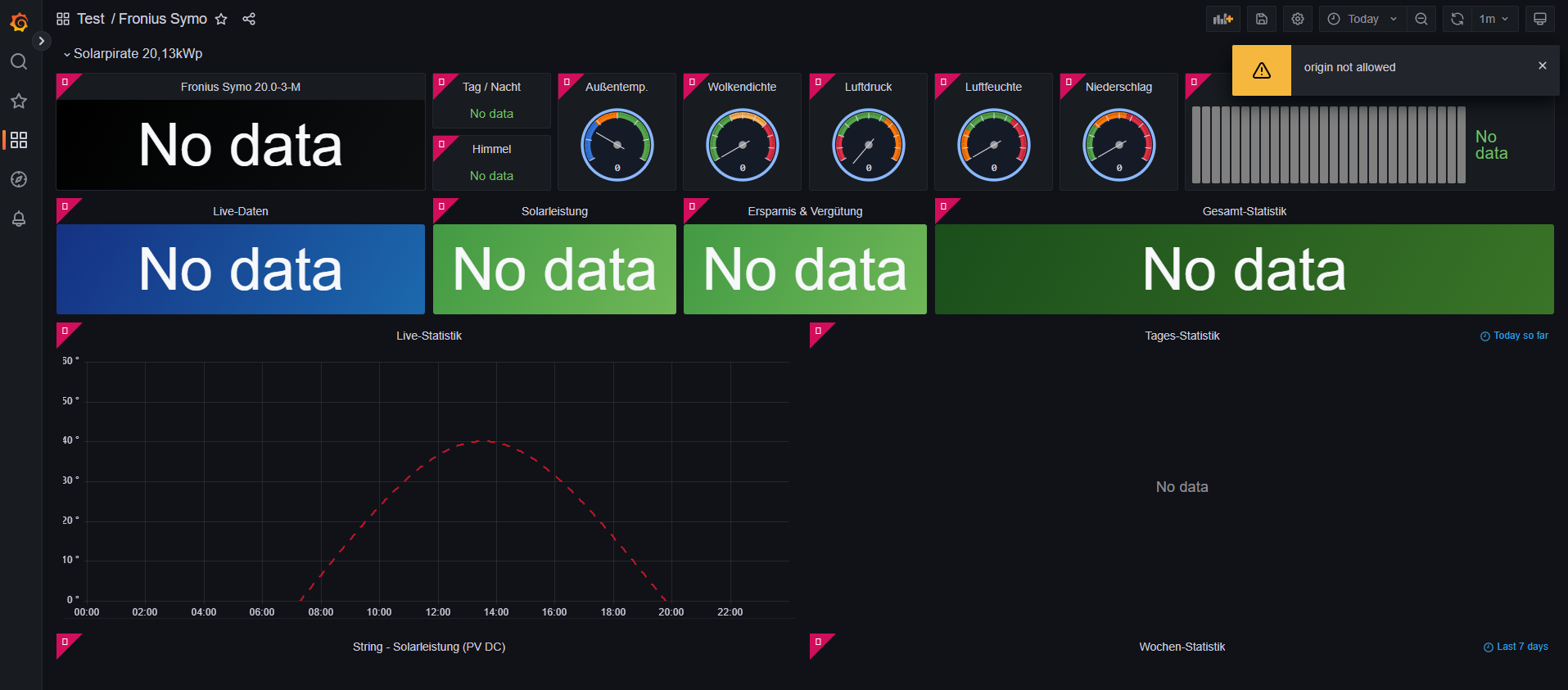 Nur jedes mal wenn ich von "außen" auf das Dashboard zugreifen möchte kommt immer die Meldung "origin not allowed" und halt wie auf dem Bild zu sehen ist No data, keine Werte. Intern funktioniert alles.
