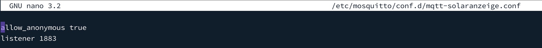 In der Datei /etc/mosquitto/conf.d/mqtt-solaranzeige.conf folgendes schreiben: