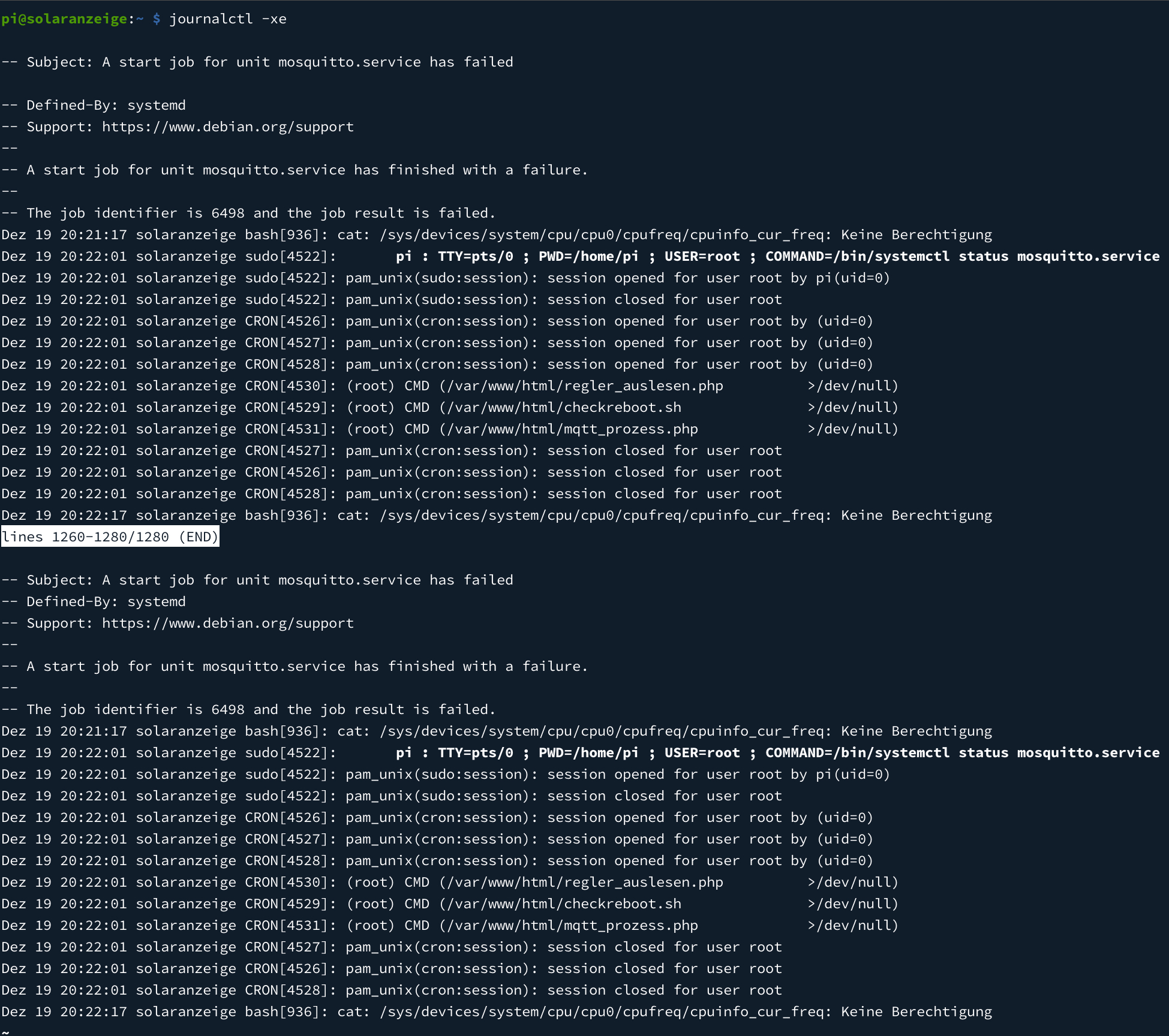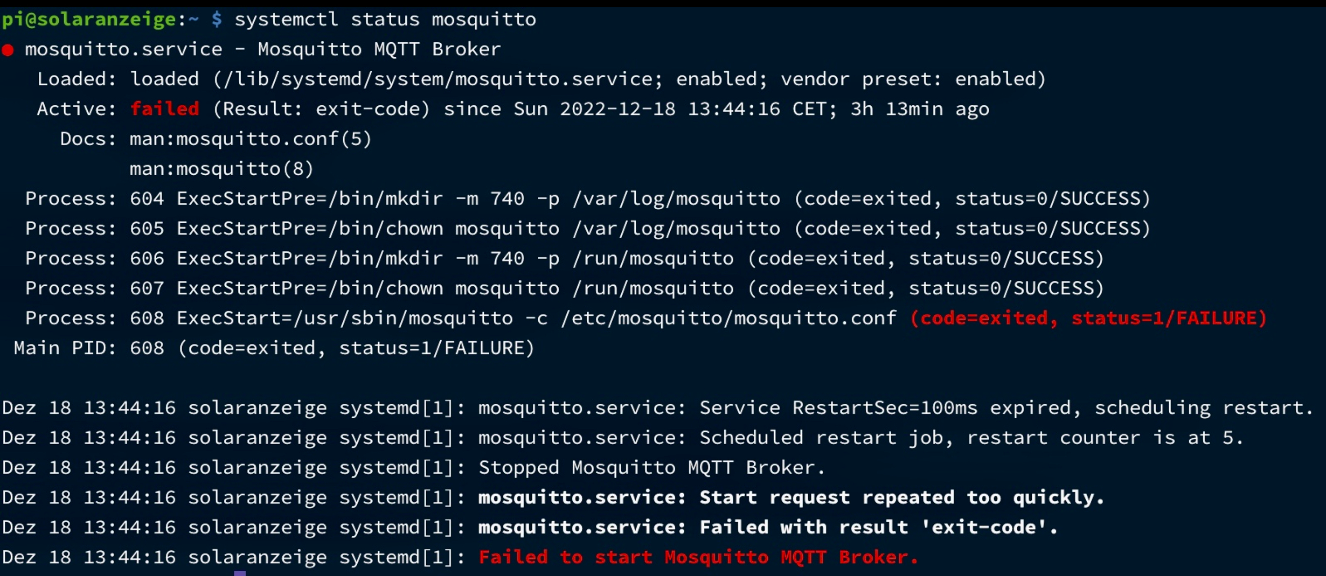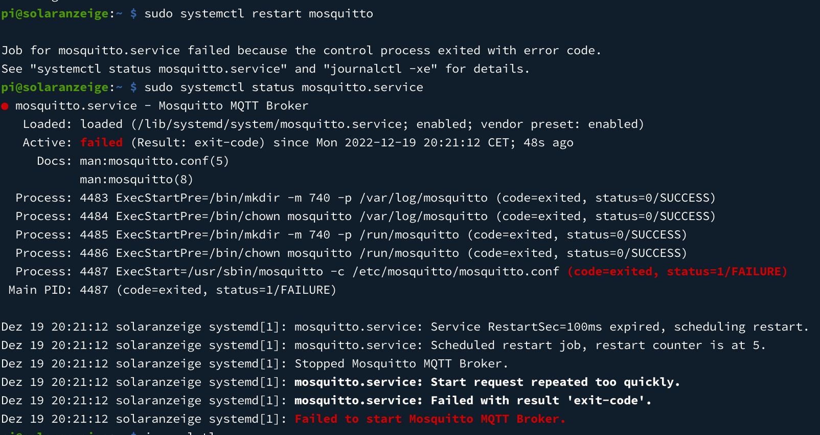 Anschließend gab Mosquitto einen Fehler aus. Solaranzeige erhält seither keine Daten mehr von Mosquitto, der die Daten vom Tasmota-Sonoff ausliest und an die Solaranzeige weiterreicht.