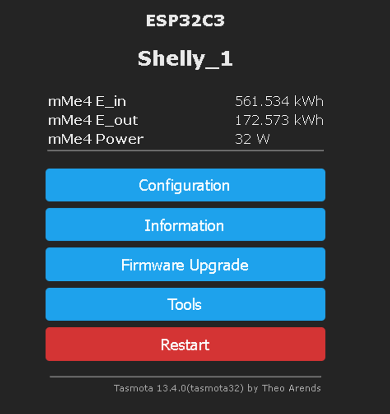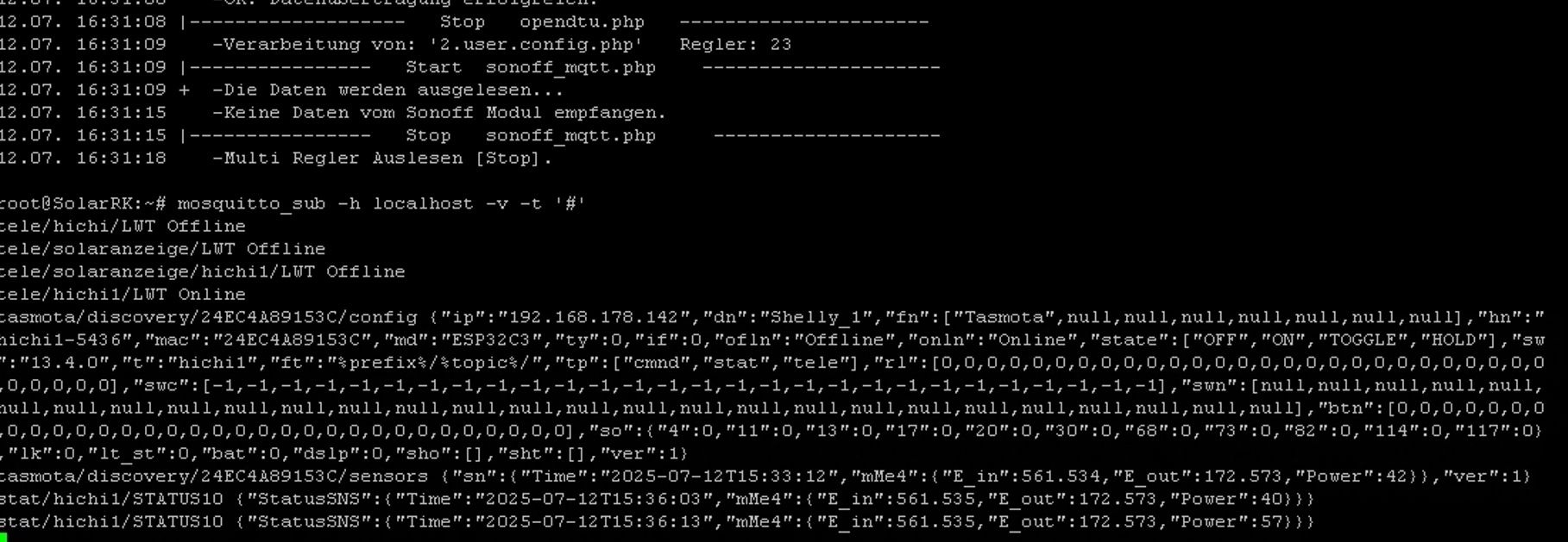 => stat/solaranzeige/hichi1/STATUS10 {"StatusSNS":{"Time":"2025-07-12T14:31:37","mMe4":{"E_in":561.510,"E_out":172.323,"Power":9}}}