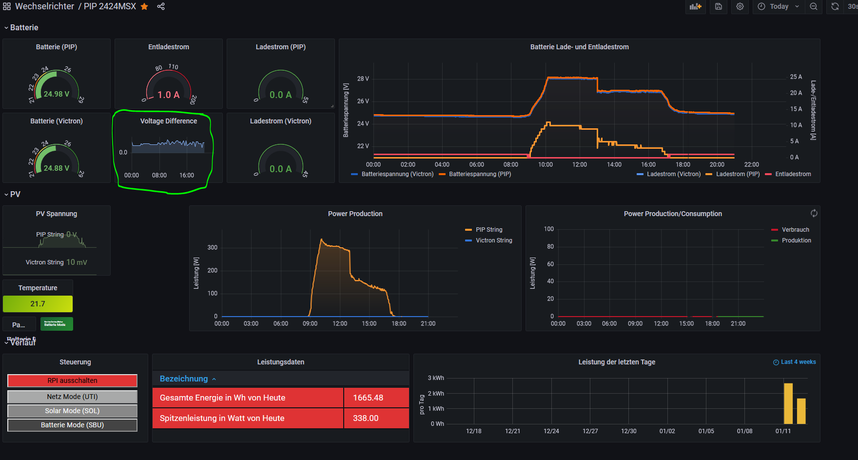 Auch sehr vorteilhaft wäre es, wenn man an einem der Regler einen kleinen Offset auf die Spannungsmessung geben könnte. Der Victron misst bisher zumindest, immer ca 0.1V weniger als der PIP (siehe Markierung im Bild). Ich kann mir vorstellen, dass dadurch von dieser Seite nicht optimal geladen werden kann. Kann man da Softwareseitig was machen oder muss ich mit den Kabeln rumspielen?