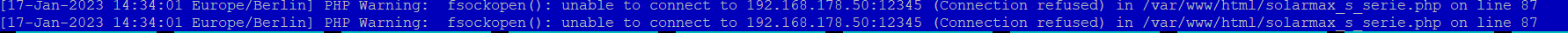 fsockopen(): unable to connect to 192.168.178.50:12345 (Connection refused) in /var/www/html/solarmax_s_serie.php on line 87