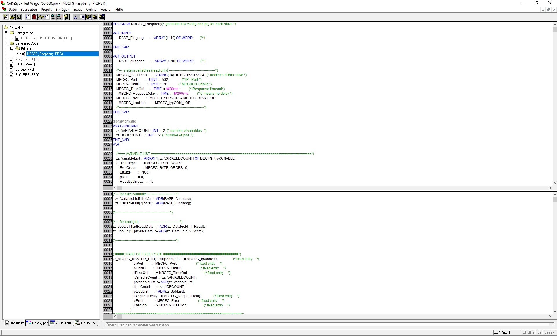 Ich habe ein Paar Screenshots von Test Wago 750-880.pro gemacht (der Controller wird mit Codesys 2.3.9.53 programmiert).