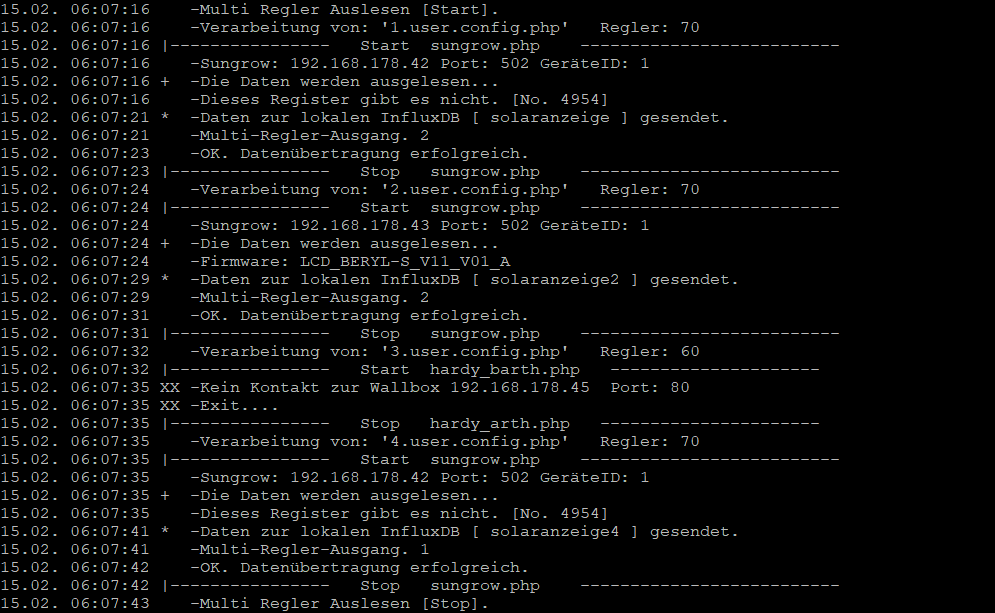 ich habe jetzt einen der WR nochmal als neues Gerät aufgenommen, um Probleme auszuschließen, jetzt sind die ID 1 und 4 identisch. Bei beiden erhalte ich jedoch einen Fehler "Dieses Register gibt es nicht. [No. 4954]", anbei der gesamte Auszug aus solaranzeige.log. Wo finde ich denn das genannte Register?