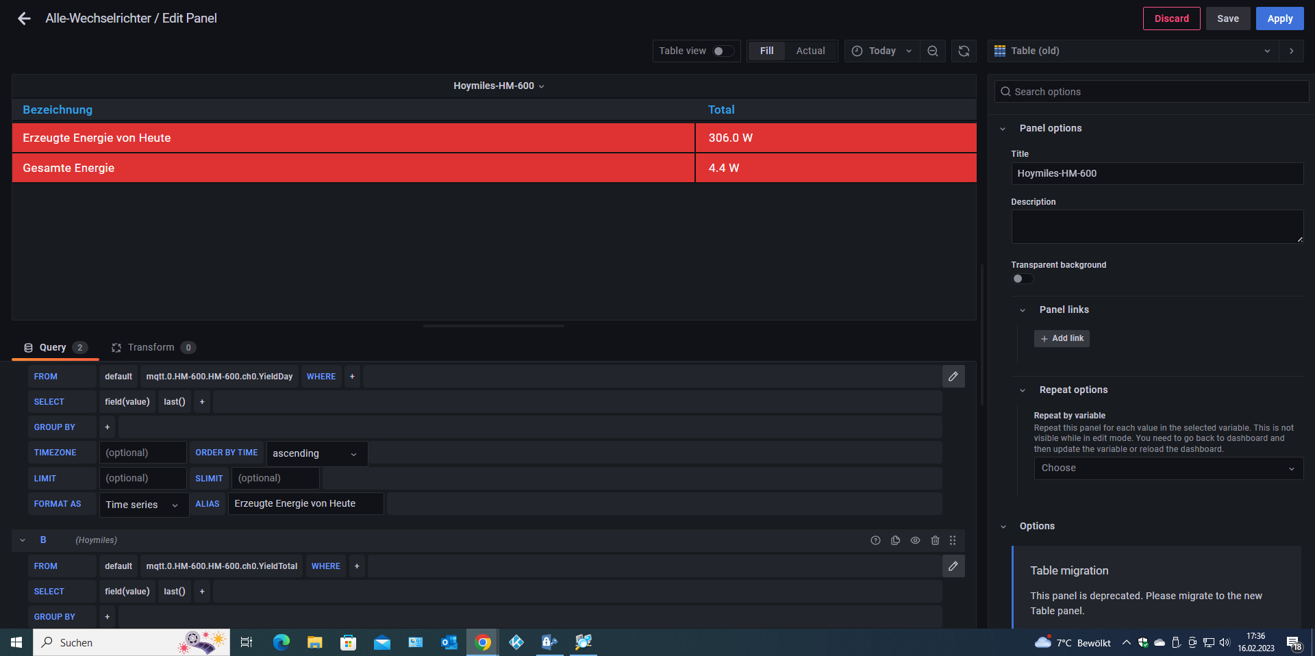 Du kannst aber in Grafana bei den "Standard Optionen" den Parameter "Unit" von W auf kW setzen. Dann werden jedoch beide Werte in kW angezeigt.