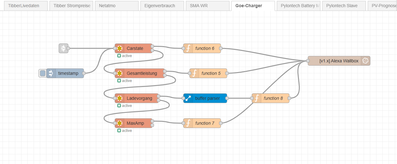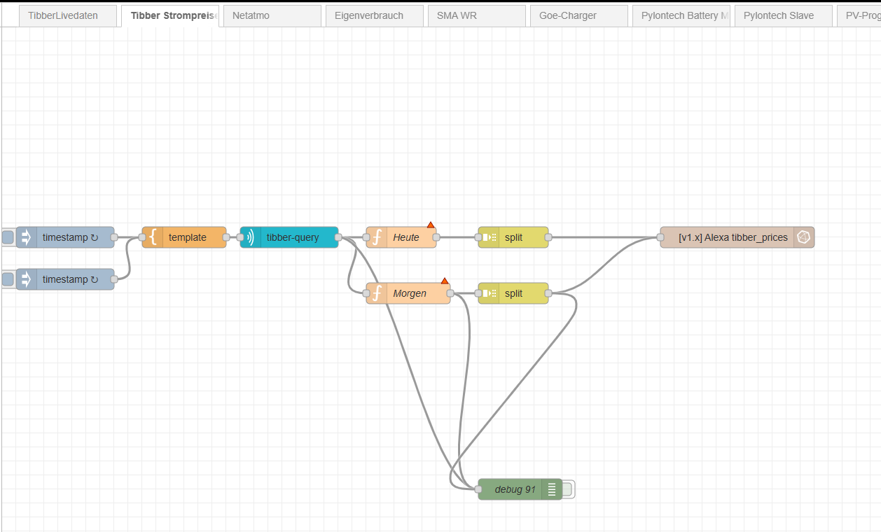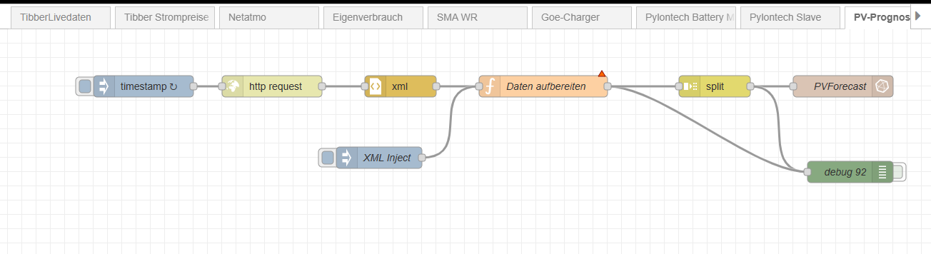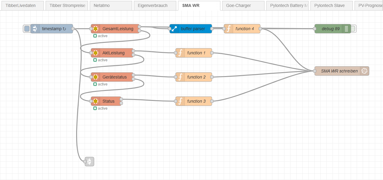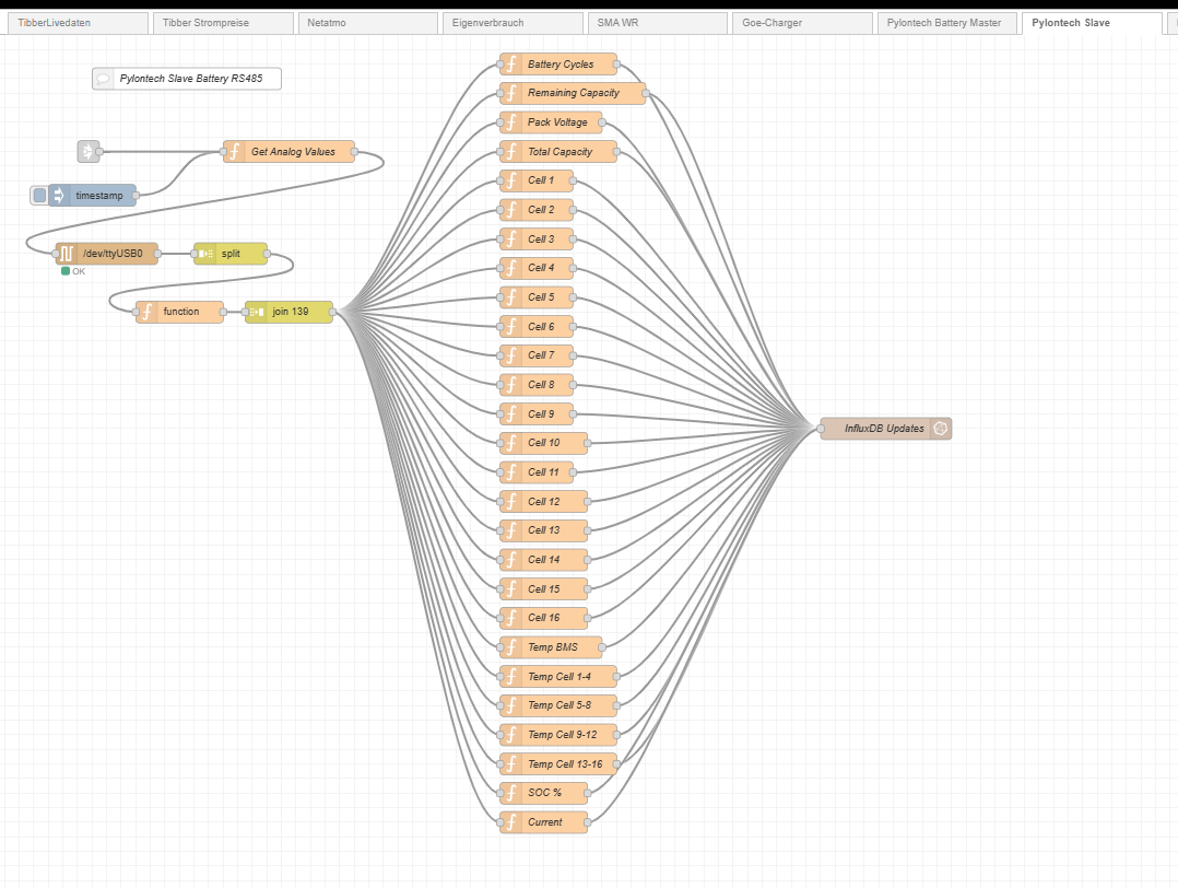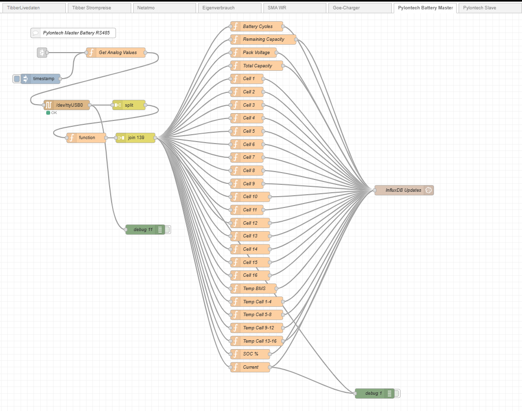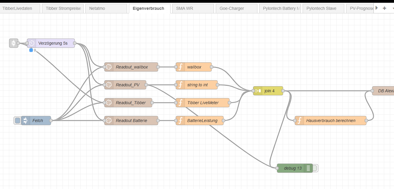 --> Lese derzeit alle meine Geräte via Node Red aus. (SMA WR, Tibber, Goe-Charger WB, Pylontech-Batterien, Solis Hybrid WR(noch im Teststadium), solarprognose.de, Netatmo, Berechnung des Hausverbrauchs)