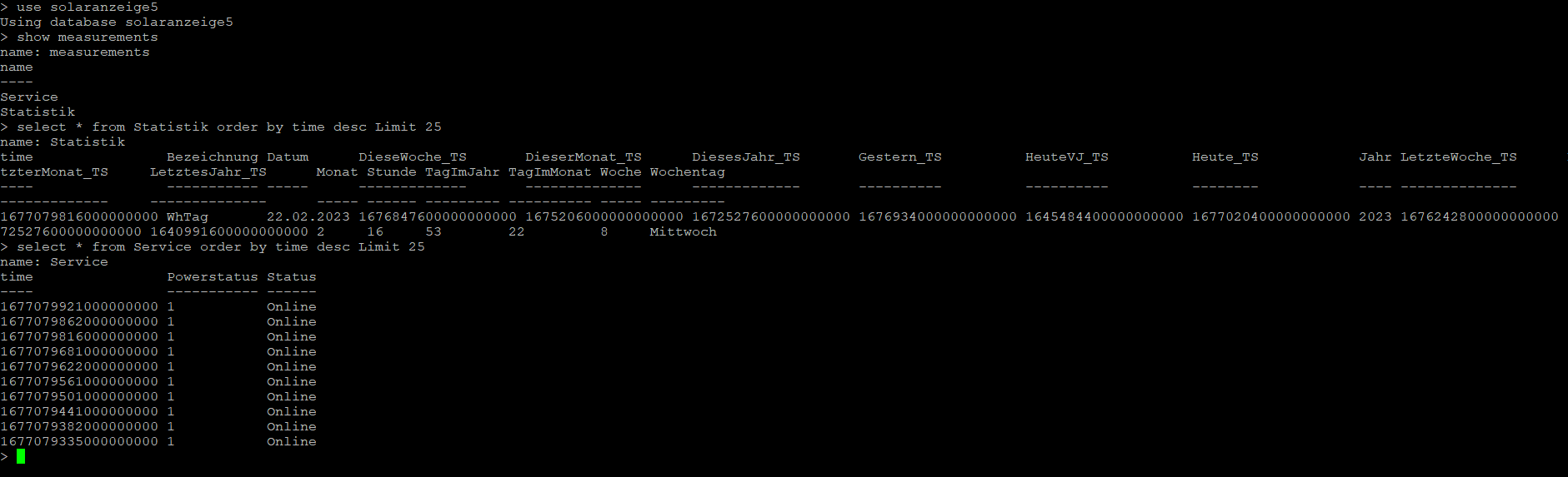 In die Solaranzeige habe ich das auch grundsätzlich eingebunden bekommen, in der solaranzeige.log wird das Gerät erkannt, die Datenbank hat die Tabellen Service und Statistik, die werden auch gefüllt, s. weiteren Screenshot.