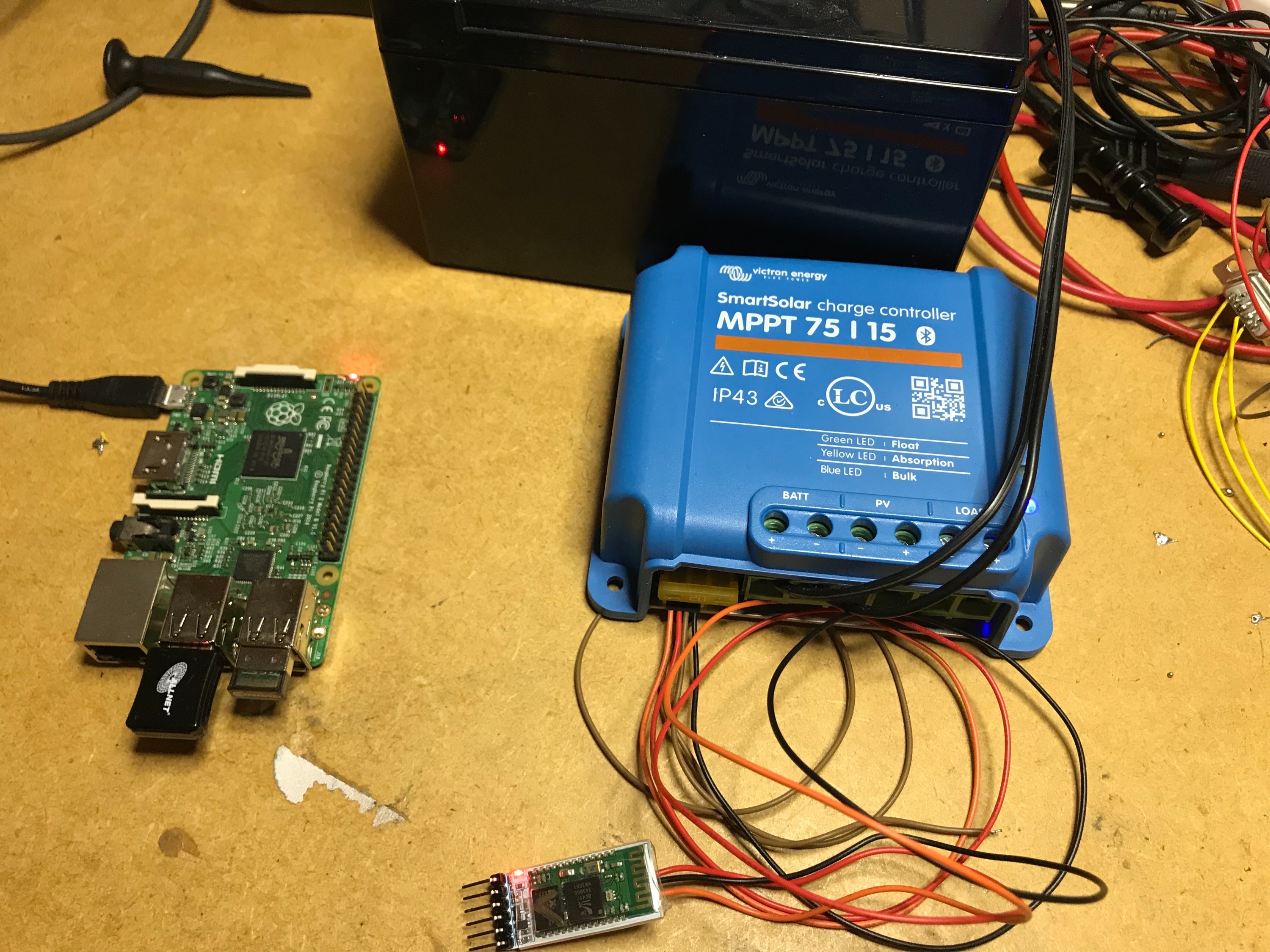 Nach einigem grübeln habe ich jetzt eine Lösung gefunden um die Daten vom Victron 75/15 per Bluetooth auszulesen. Victron gibt die API, um Daten über das integrierte Bluetooth Modul auszulesen nicht frei, also musst eine andere Lösung her. Es gibt kleine Bluetoothmodule HC-05, die kosten so ab 6€ je nachdem wo man die kauft. Diese Module sind klein und lassen sich für diesen Zweck gut verwenden (alle Infos über das HC-05 sind im Internet verfügbar)