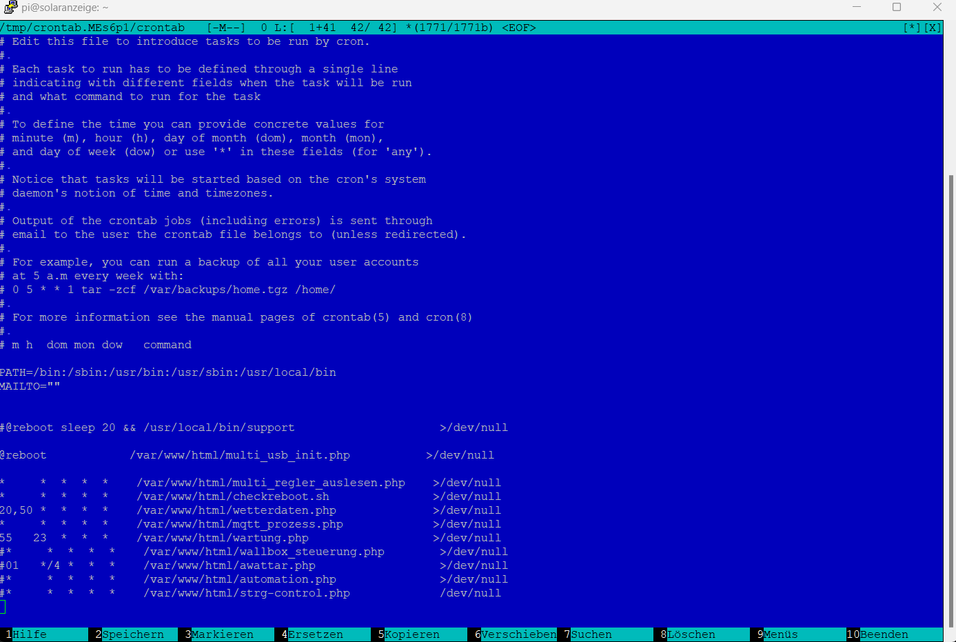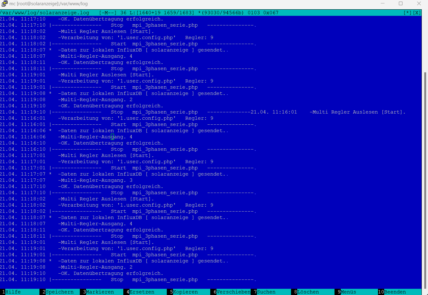 ich bin gerade dabei meine komplette Anlage von ioBroker auf Solaranzeige unzustellen. SingleRegler mit einem MPI5k funktioniert. Nun will ich als nächstes ein Shelly 3em einbinden. Ich habe alles wie in dem PDF Multiregler steht durchgeführt. Leider wird der Shelly nicht ausgelesen oder etwas in die DB geschrieben. Beim Betrachten des logs ist zu erkenne, das nur die 1.user.config.php für den MPI5k abgearbeitet wird. Diese läuft - zwar mit einer Warnung - durch und schreib auf in die Influx auf localhost aber das wa´s dann. Die 2.user... wird im log nicht erwähnt.