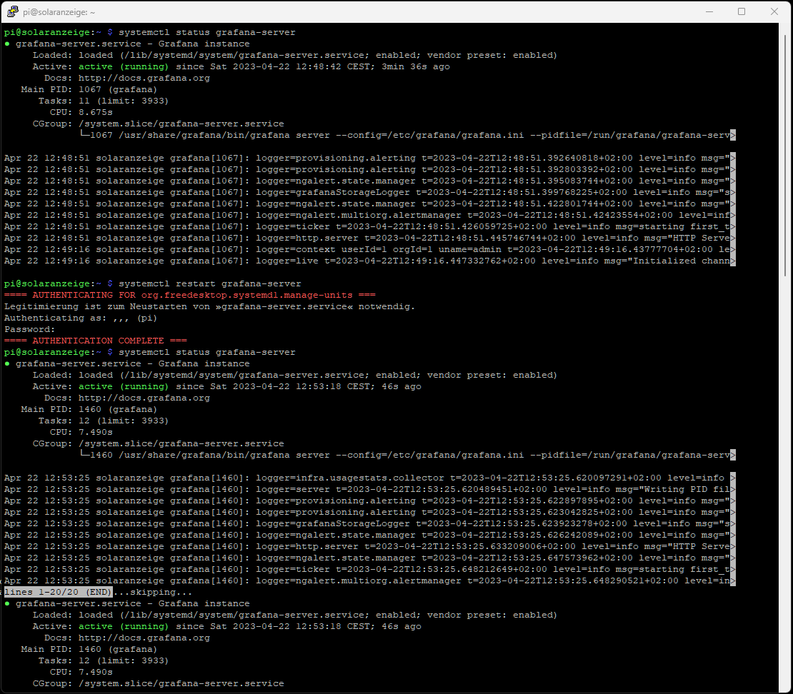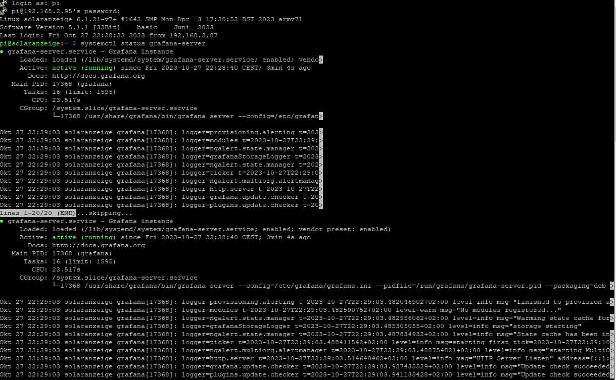 ich habe dasselbe Problem. Auf dem Screenshot sieht man, dass ich mit systemctl restart grafana-server den Server neu gestartet habe - die Oberfläche ist jedoch immer noch nicht erreichbar. Das Problem habe ich nach ca. 7 Tagen Betrieb. Während dessen ist der PI problemlos erreichbar. Nach einer Woche leider nicht mehr.
