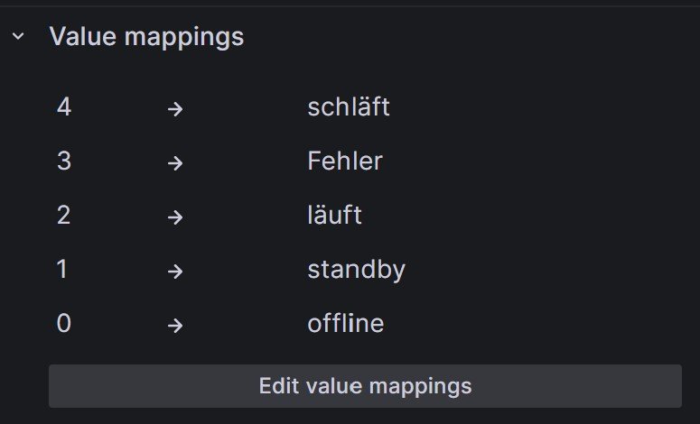 konnte nun, unter Aktivierung von "Alarm1Bit" anstelle von "Alarm1", die bitweise Darstellung der Fehlermeldung nutzen und über das value mapping in Grafana dann die entsprechende Fehler-ID anzeigen lassen.