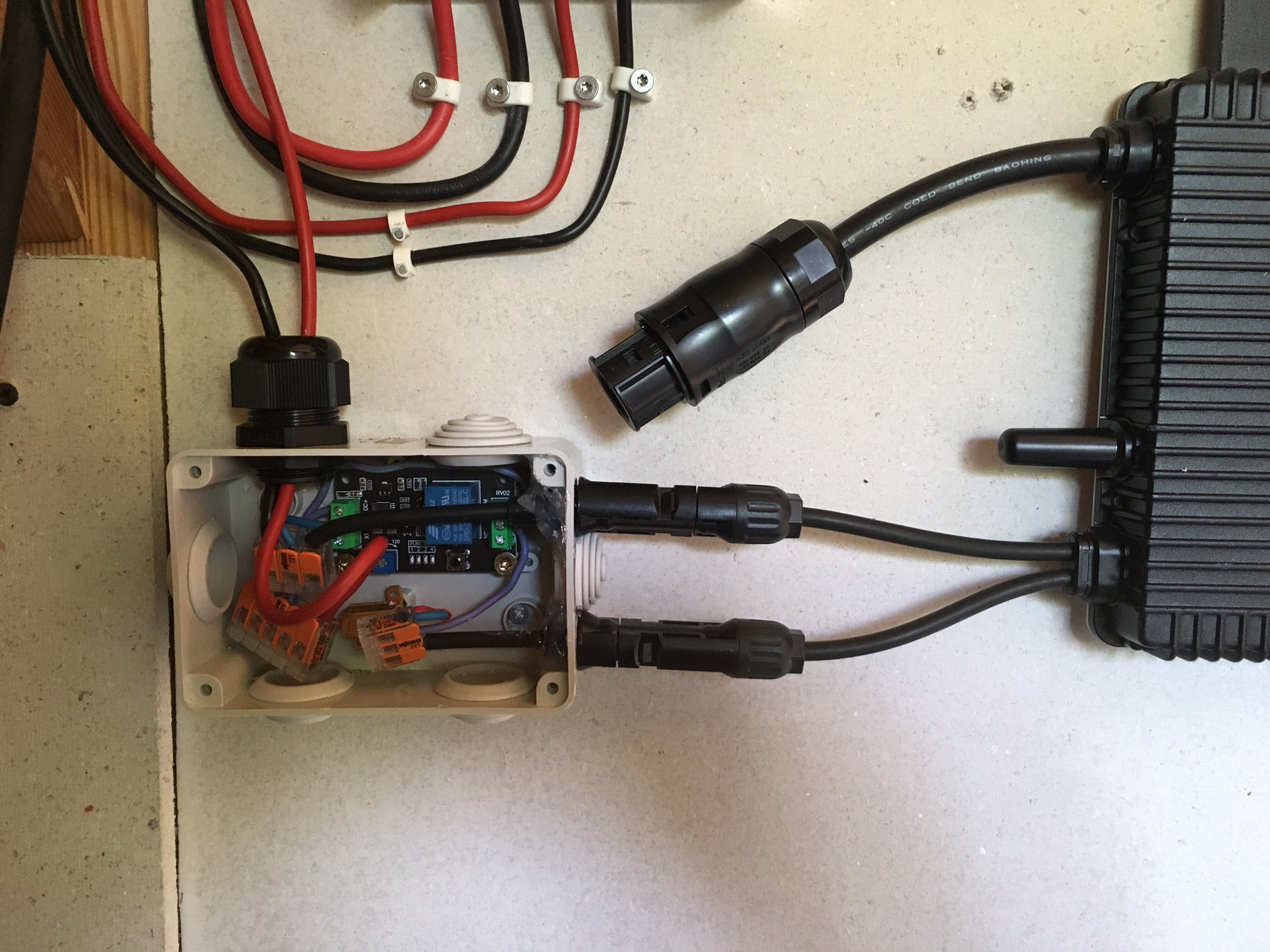 Die Elektronik habe ich in eine Verteilerdose eingebaut. Rechts habe ich mit Schmelzkleber zwei MC4 Stecker eingeklebt, damit ich die PV-Eingänge des HM-300 einstecken kann.
