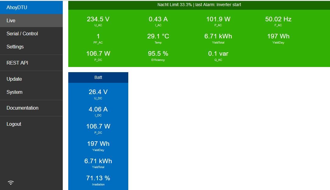 Den HM-300 überwache ich mit einer AhoyDTU bzw. der Tasmota-Oberfläche. in der AhoyDTU kann ich auch die Einspeiseleistung des Wechselrichters anpassen. Derzeit habe ich sie auf 100W eingestellt. Laut AhoyDTU zieht er dafür 106W von der Batterie. Das entspricht einem Wirkungsgrad von 94% . Damit bin ich zufrieden. Einen Step-Up DC/DC Konverter habe ich nicht eingebaut.