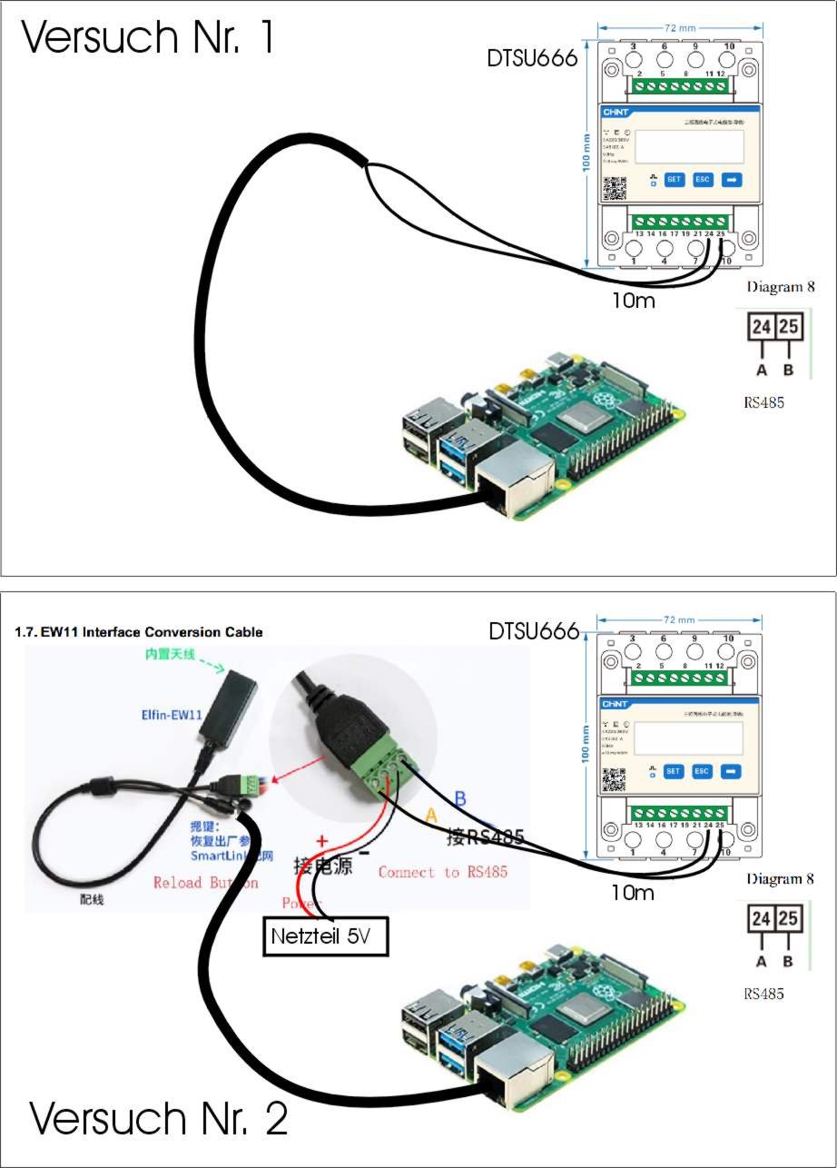 b) Den DTSU666 mit einem Elfin EW11 mit einem Kabel verbinden. Die Kommunikation von der Solaranzeige läuft dann via WLAN und dem Protokoll Modbus TCP zum EW11 und von dort via Kabel zum DTSU666 . Das habe ich hier beschrieben. Die Lösung erfordert aber PHP Programmierkenntnisse. Da der Elfin EW11 via WLAN mit dem Raspberry kommuniziert, ist in Deinem Versuch2 die Kabelverbindung zum Raspberry überflüssig