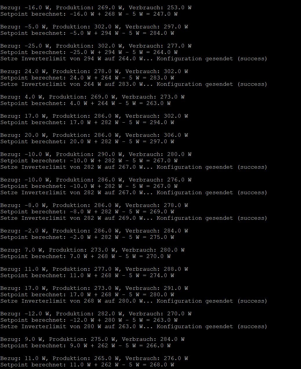 - Die Schleife läuft alle 5 Sekunden (time.sleep(5)). Das hat keinen Sinn, weil das Umstellen des Einspeise-Limits bei den Hoymiles Wechselrichtern einige Minuten dauert. Alle 10-15 Minuten reicht aus.