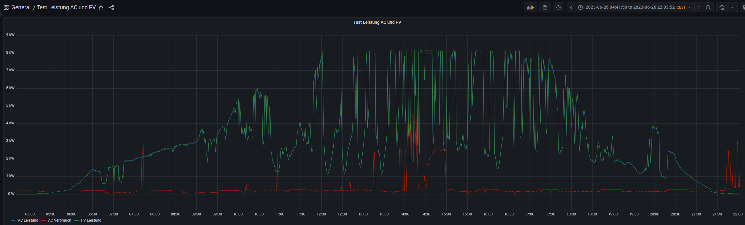 Am 26.6. sieht man schön wie die PV Erzeugung früh morgens gegen 05:30 beginnt, und wie sie gegen 21:30 Uhr endet. An den Tagen wurde der PV Strom erzeugt und ist entweder ins Haus geschickt worden oder ins Netz.