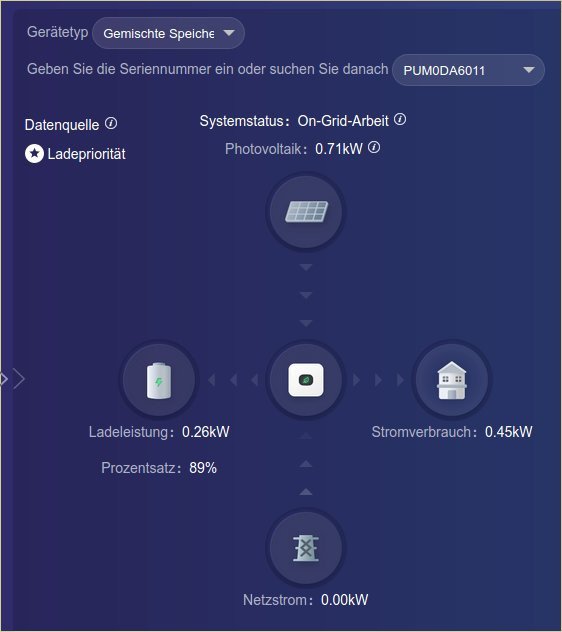 Läuft jetzt, bringt paar Watt von Modulen, Rest nimmt er vom Speicher und bedient damit die Verbraucher