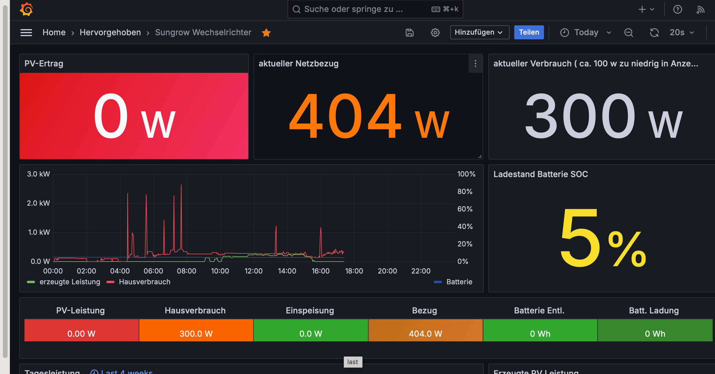 Nachdem ich die China-iSolarCloud erkundet hatte, kam der Wunsch nach einer inhouse-Lösung auf und ich bin auf "Solaranzeige" gestoßen. Dann einen Raspi bestellt, konfiguriert und los ging es. Habe ein wenig gebraucht aber dank Ulrich´s "Hilfe zur Selbsthilfe" und ein wenig Programmiererfahrung (ist fast 40 Jahre her) habe ich es hin bekommen. Fast alle haben einen schwarzen Hintergrund in Grafana, aber mein´s ist es nicht. Genauso interessieren mich keine Summen oder Vergütungen, geschweige denn habe ich eine Wallbox oder ähnliches. Mich interessieren die täglichen Werte und deren Optimierung besonders über die anstehenden "dunklen" Monate. Somit nachfolgend mein Dashboard: