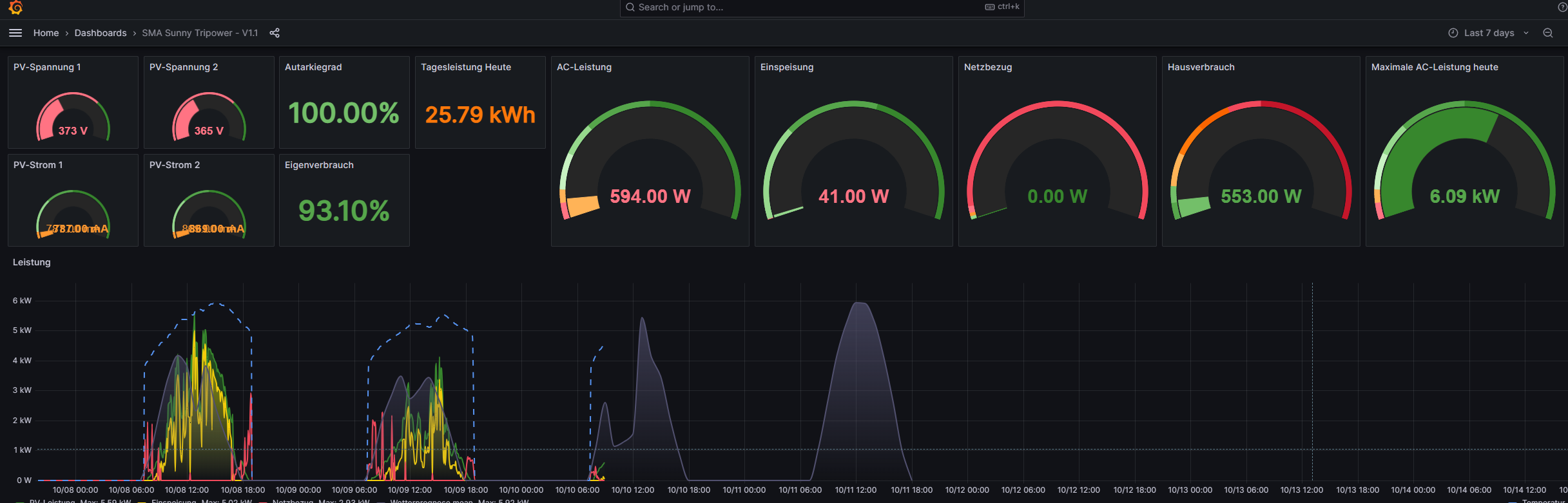 Trotzdem zeigt mir Grafana schon den ganzen Tag "No Data" an. Bie den aktuellen Werten und dem Betriebszustand des Wechselrichters. Neustart usw. hat nix gebracht. Ich hole mir die Werte parallel auch noch an einen iobroker Server über ModBus usw. das funktioniert einwandfrei.