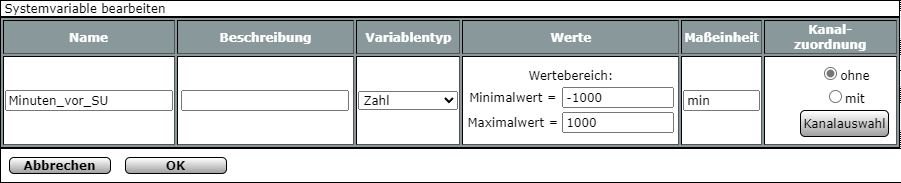 <systemVariable name="Minuten_vor_SU" variable="-19.000000" value="-19.000000" value_list="" ise_id="8108" min="-1000" max="1000" unit="min" type="4" subtype="0" logged="false" visible="true" timestamp="1698854220" value_name_0="" value_name_1=""/>
