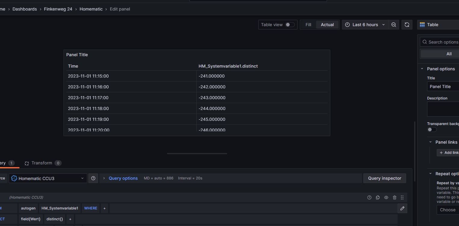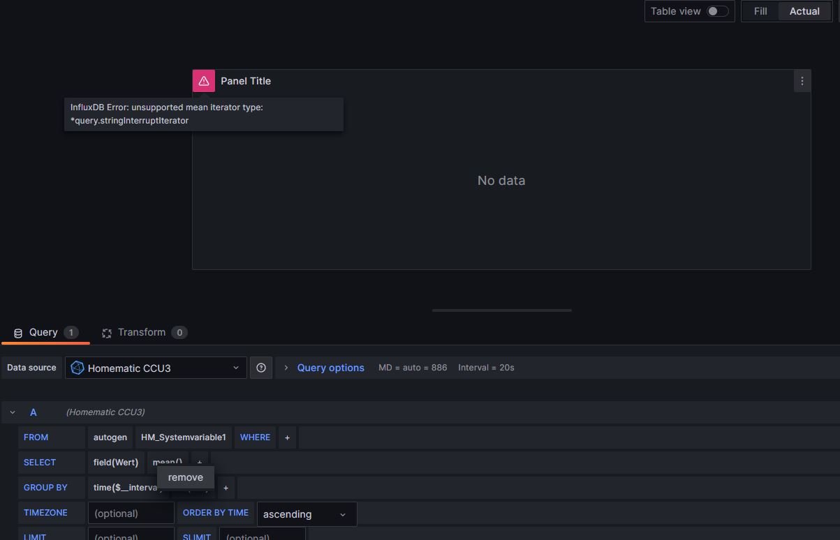 Alles was von der HomeMatic ausgelesen wird, wird von der Solaranzeige als Text in die Influx Datenbank geschrieben. Wenn man sicher ist, dass der Wert eine Zahl ist, muss der Text in Grafana erst wieder in eine Zahl umgewandelt werden.