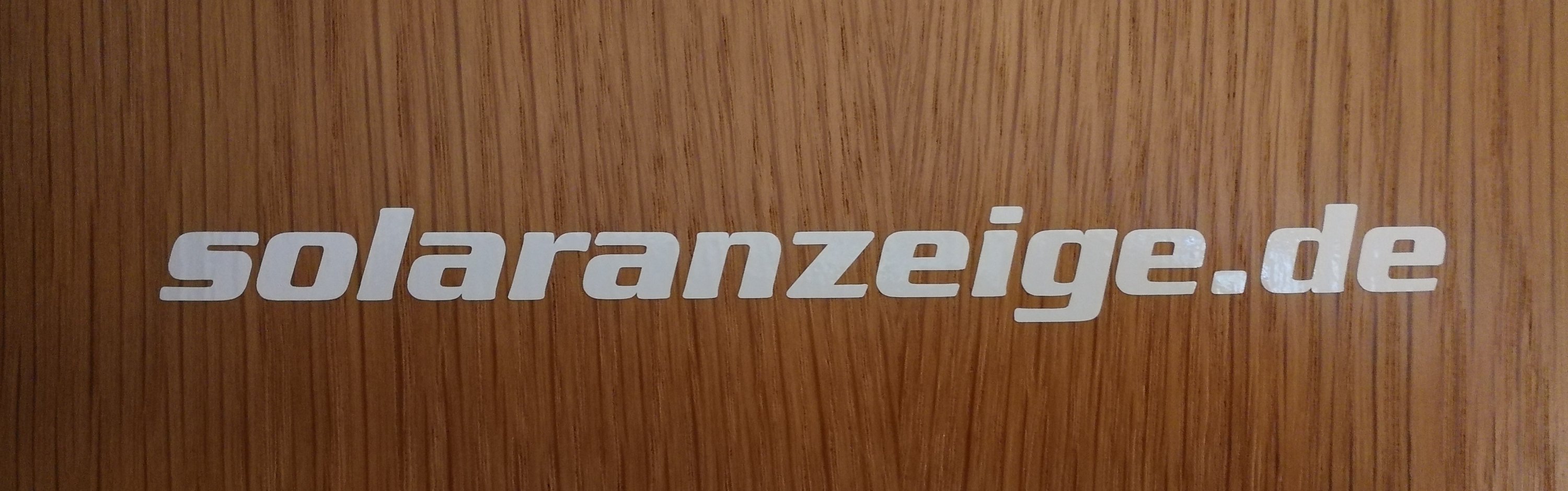 Ich habe Aufkleber für das Auto herstellen lassen. Es ist nur der Schriftzug "solaranzeige.de" wie auf dem Bild zu sehen. (20 cm x 1,9 cm) Mit der Trägerfolie gelingt das Aufkleben schnell und einfach. Die Trägerfolie wird danach abgezogen. Der Schriftzug klebt auf allen glatten Flächen inkl. Glas.